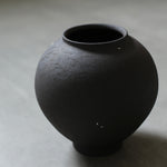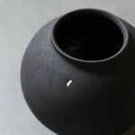 A variation on the moon jar form, this vessel reflects Papworth’s ongoing exploration of volume, surface, and restraint. Hand-thrown in stoneware and finished in a matte black glaze, the surface is interrupted by small inlaid chips of porcelain, creating a quiet contrast in tone and texture. The rounded body tapers subtly at the base and opens to a clean, wide rim, giving the piece a balanced and considered presence.