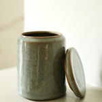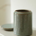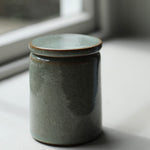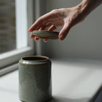 This elegant lidded jar by Will Papworth is hand-thrown in stoneware clay and finished in a subtle celadon glaze. The refined, columnar form is softened by rounded contours, offering a harmonious balance of structure and softness. The translucent glaze reveals gentle variations in tone: an earthy, muted green with a smooth surface emphasising the fine details within the piece.