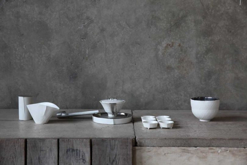 The installation leans towards minimalism, comprising of a teapot, a tea tray, a tea serving pot, a waste bowl, a tea caddy, six teacups and a teaspoon. The angular shapes are distinct to Wu's practice and make an exquisite collection of utensils used for brewing tea that can be treasured for a lifetime.