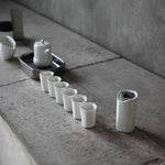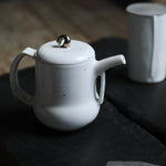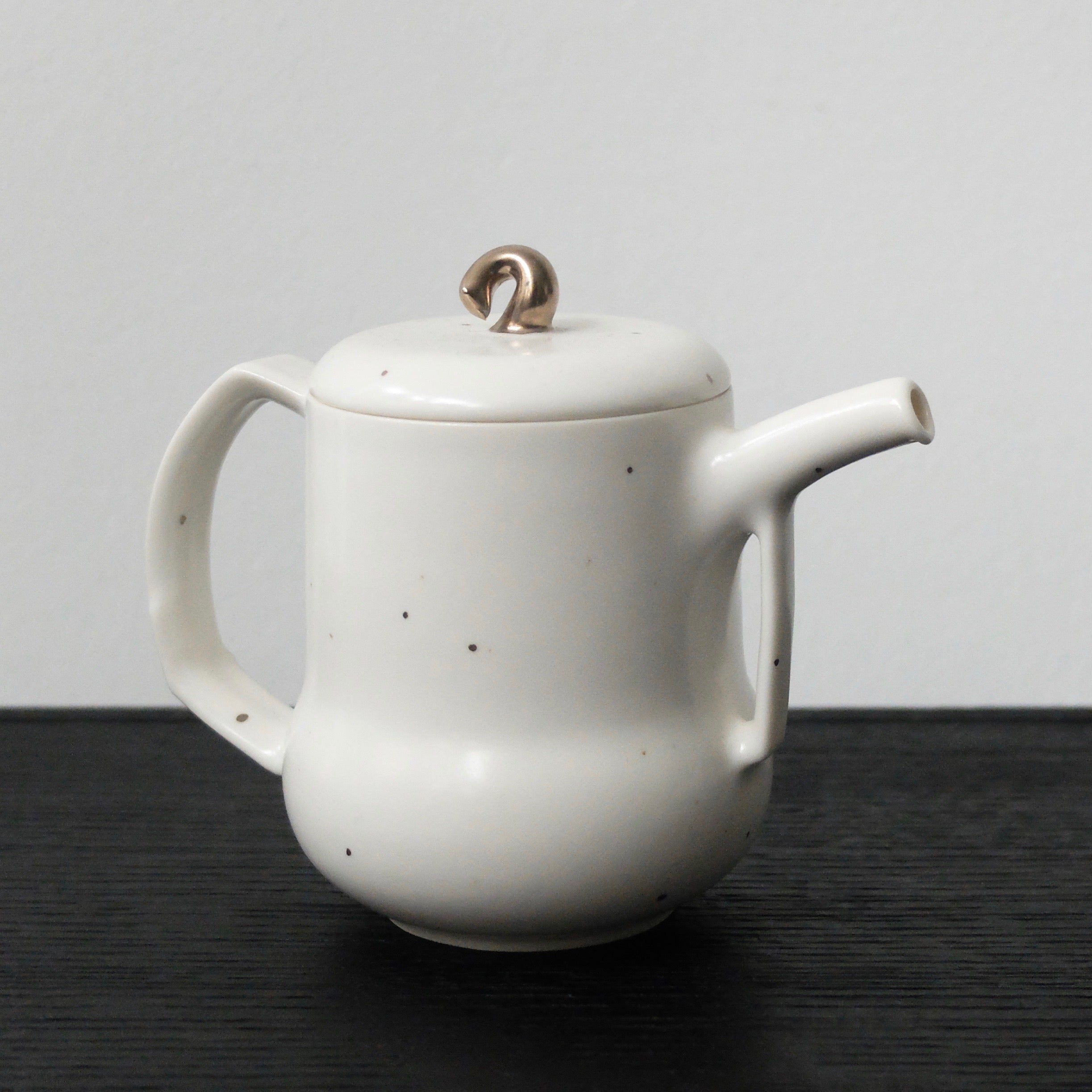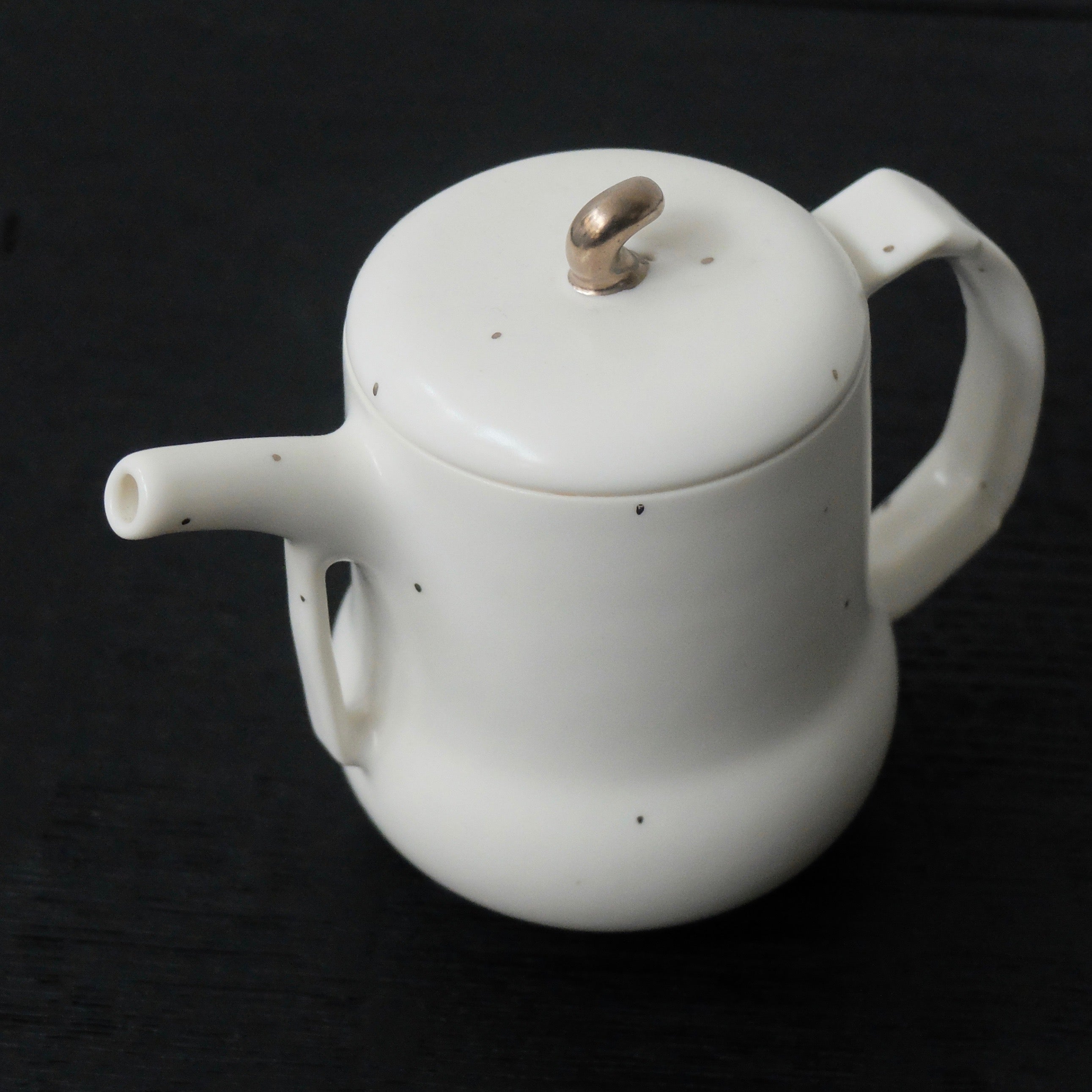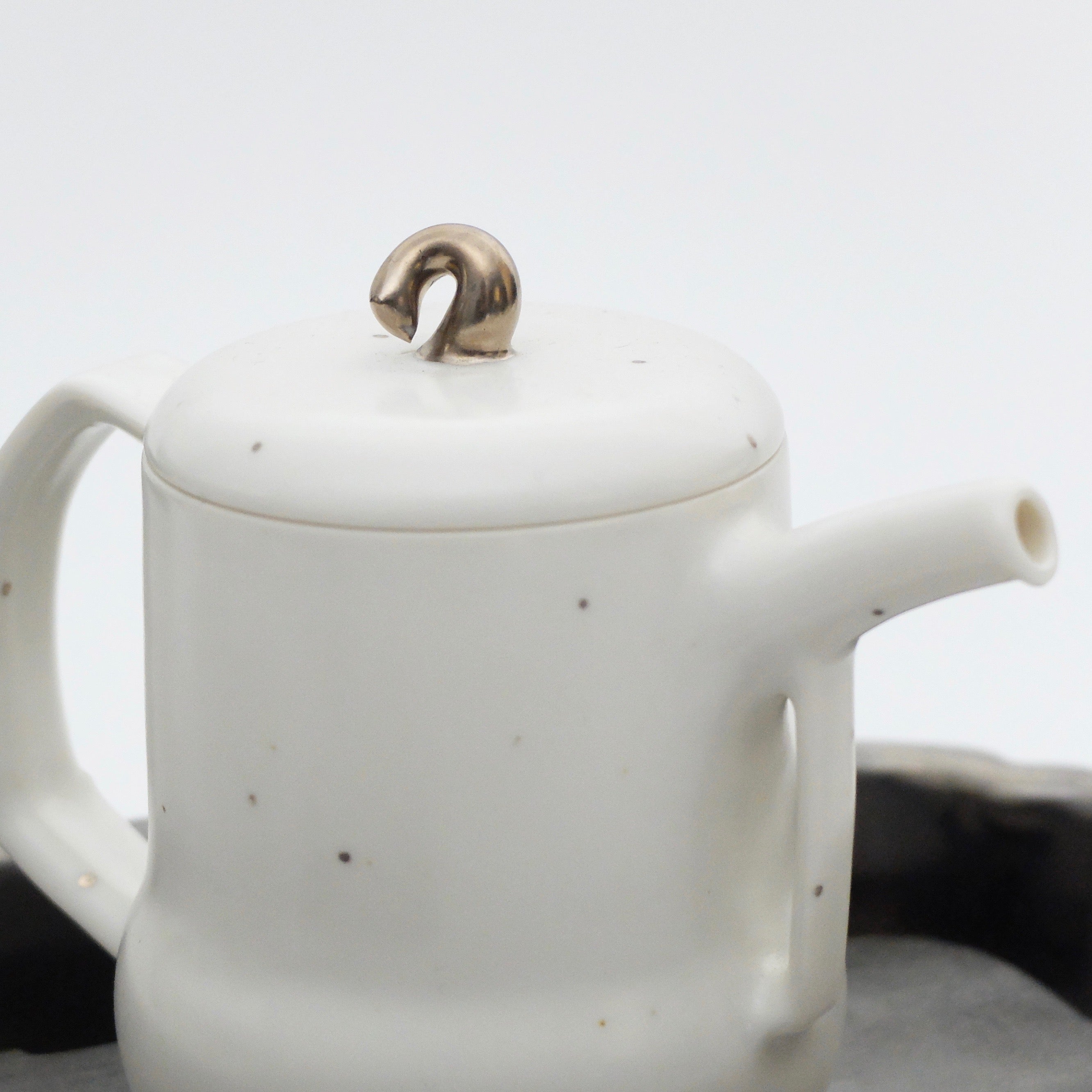 A beautiful tea pot, part of an installation handmade by artist Wu Wei Cheng. Created slowly and skilfully in his Taichung studio, the works have a raw and contemporary feel. He uses white clay to reveal the natural hue of the tea, accompanied by black clay which works as a visual juxtaposition.