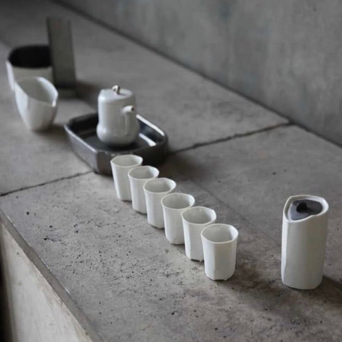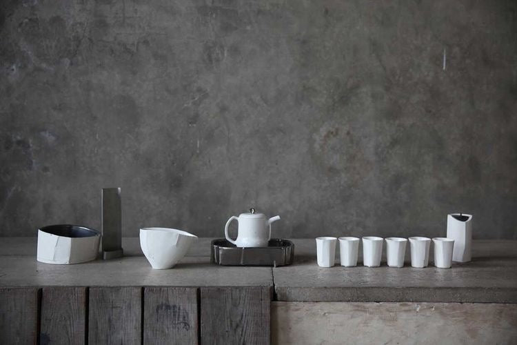 The installation leans towards minimalism, comprising of a teapot, a tea tray, a tea serving pot, a waste bowl, a tea caddy, six teacups and a teaspoon. The angular shapes are distinct to Wu's practice and make an exquisite collection of utensils used for brewing tea that can be treasured for a lifetime.