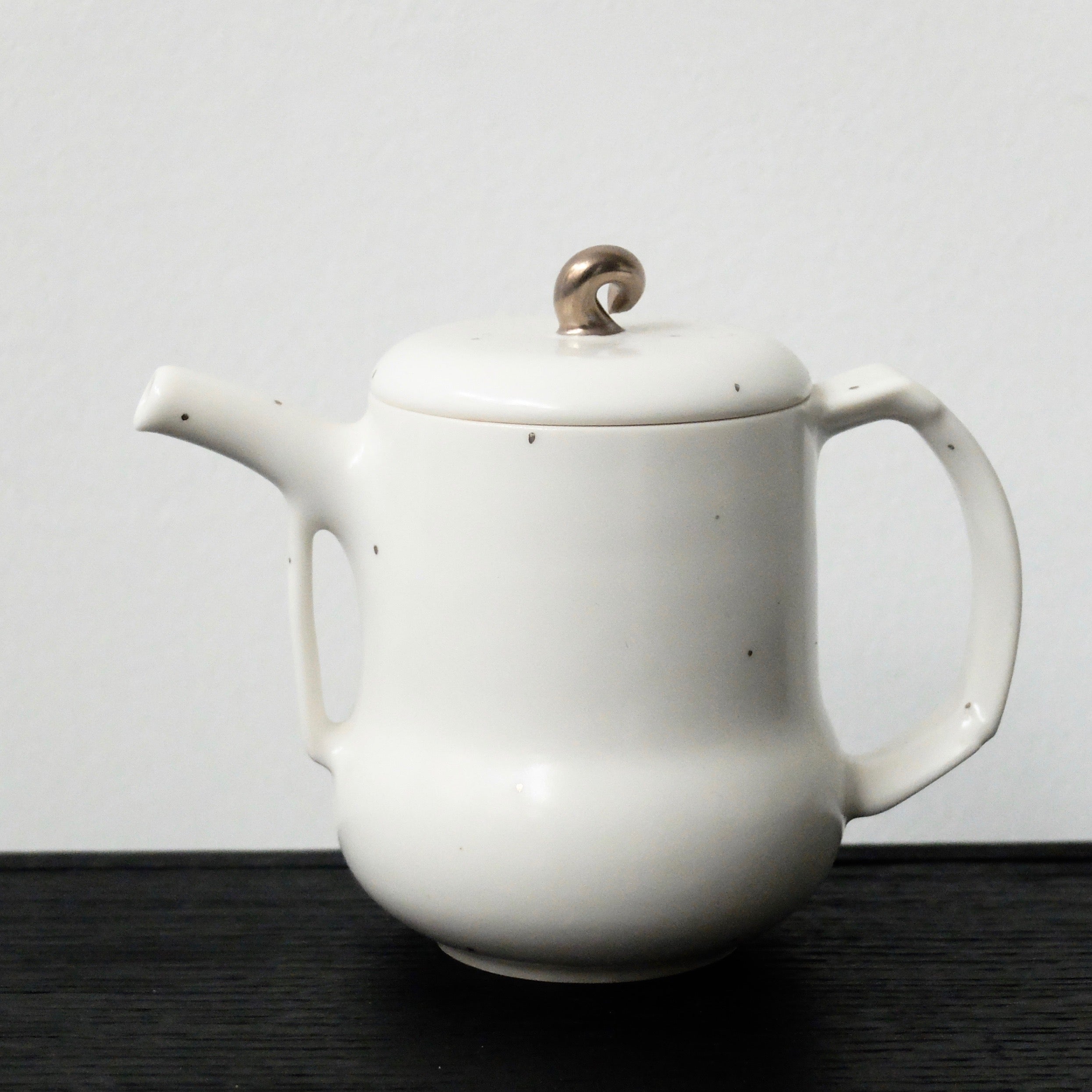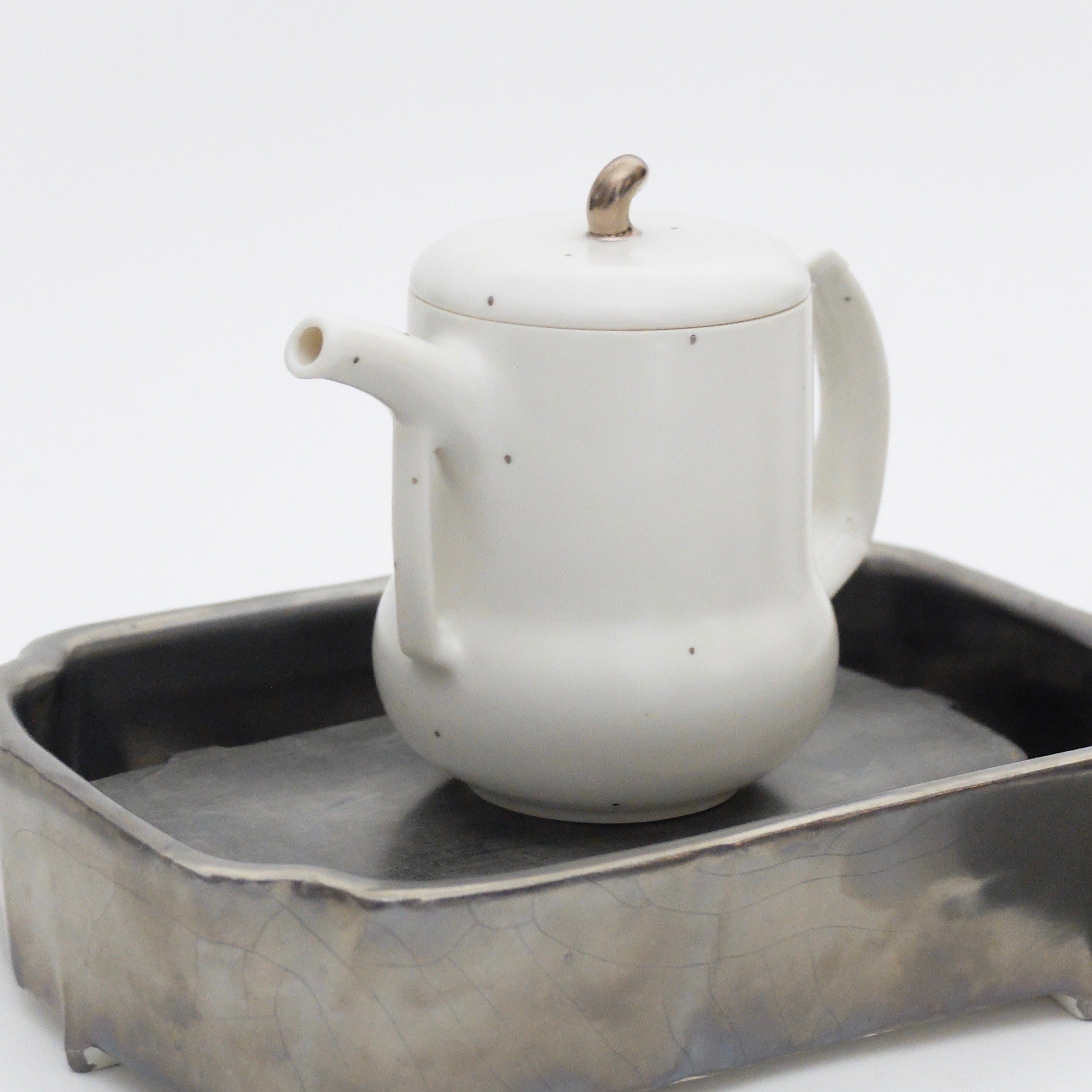 Wu cleverly balances tradition with innovation, celebrating the art of the tea ceremony. He pushes the boundaries of ceramics simultaneously, through creating his sculptural tea instruments. The precise forms are lightly textured and partially glazed with metallic silver tones, drawing in the eye to look closer.