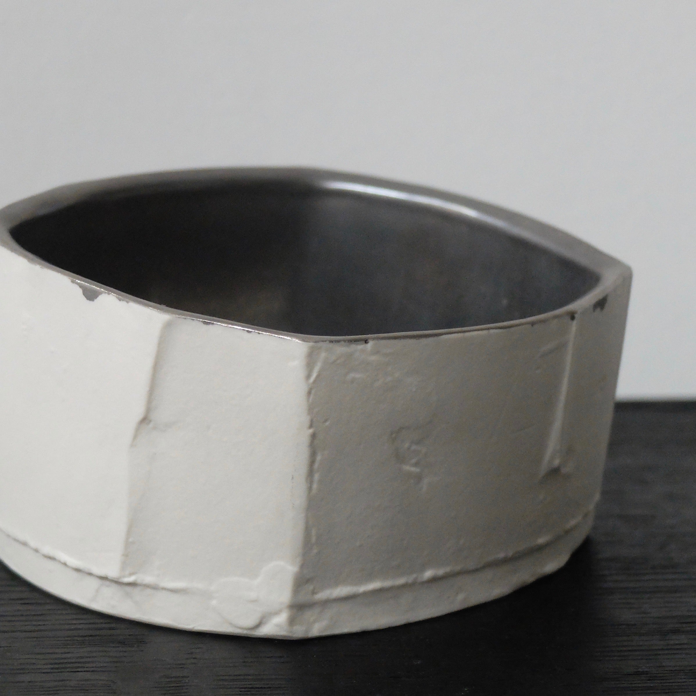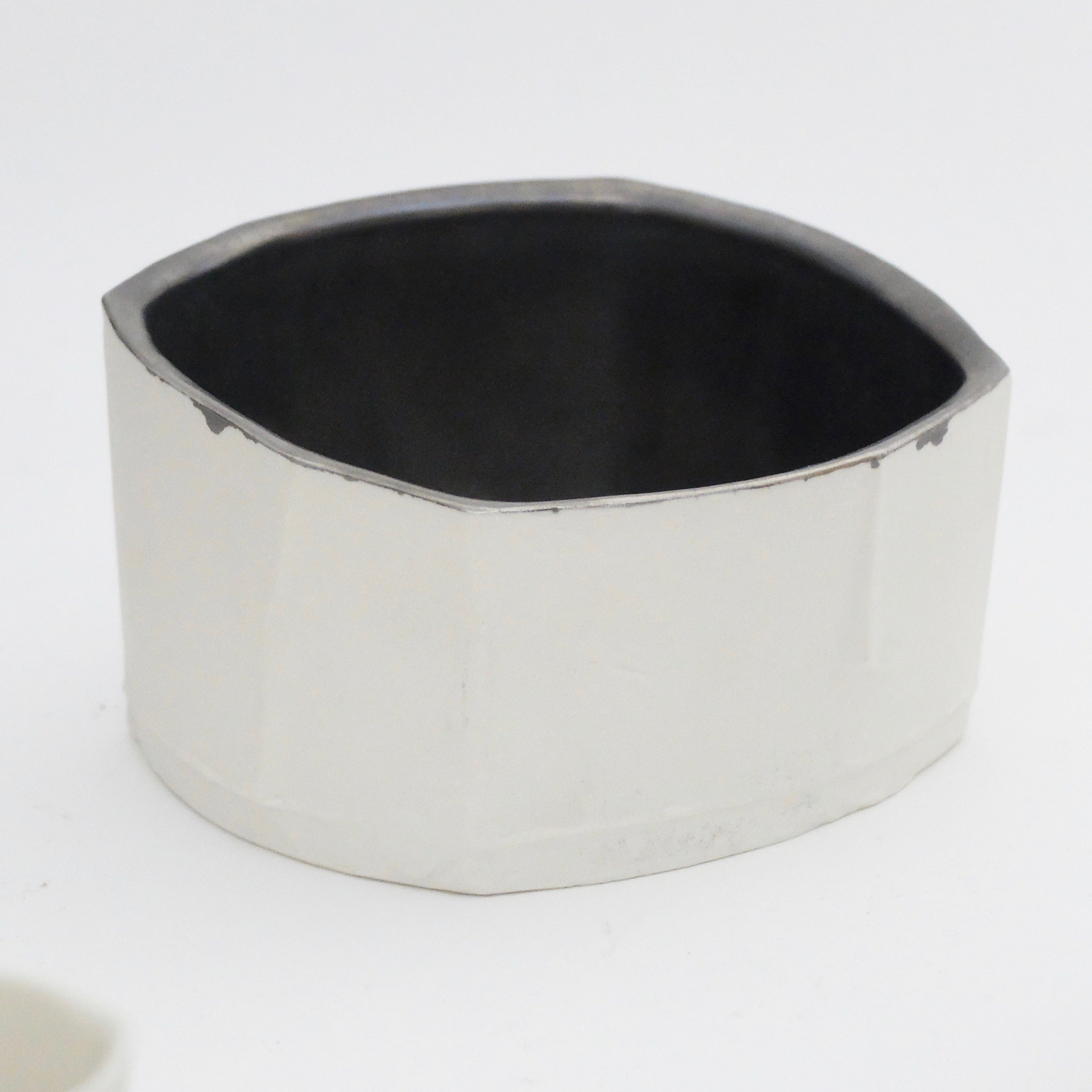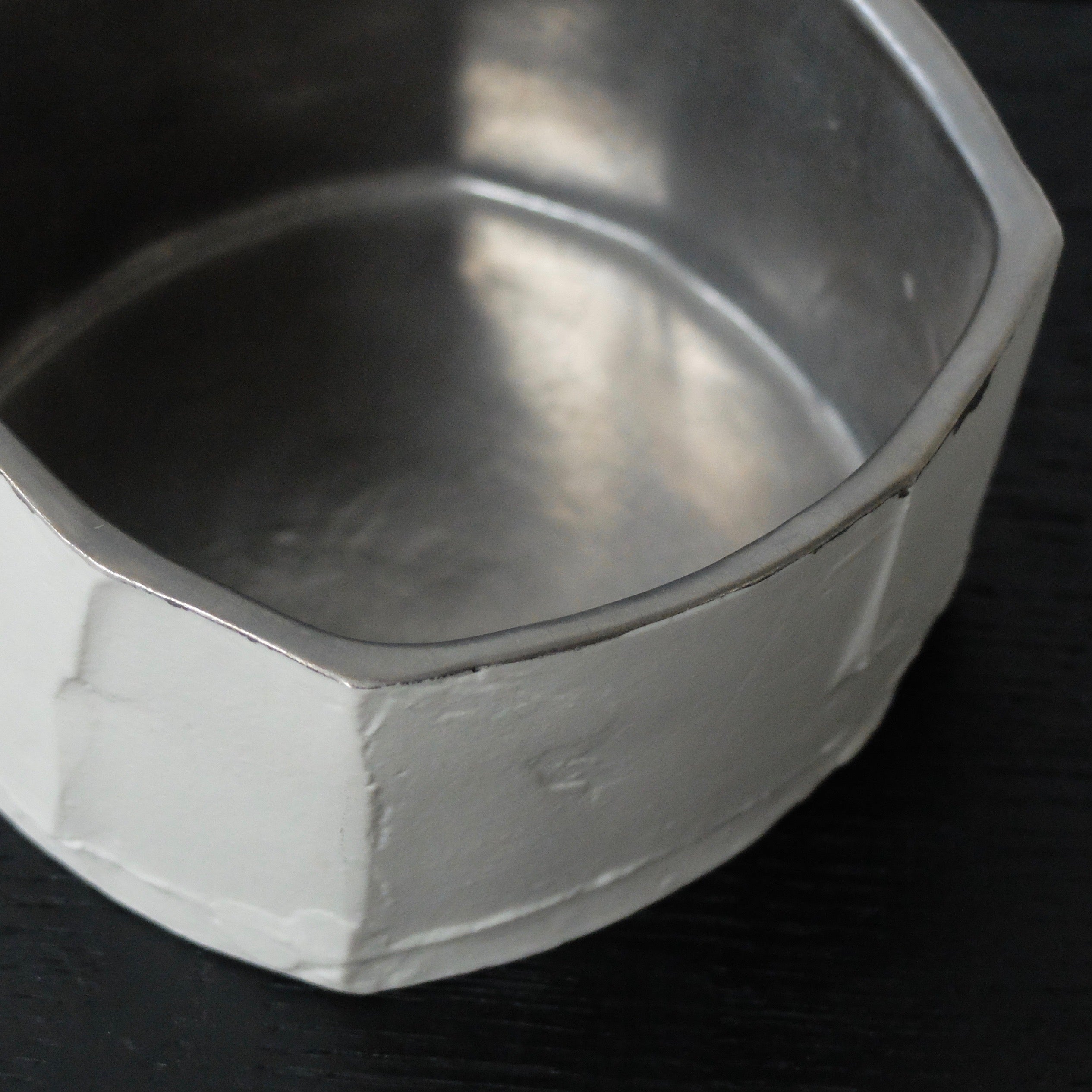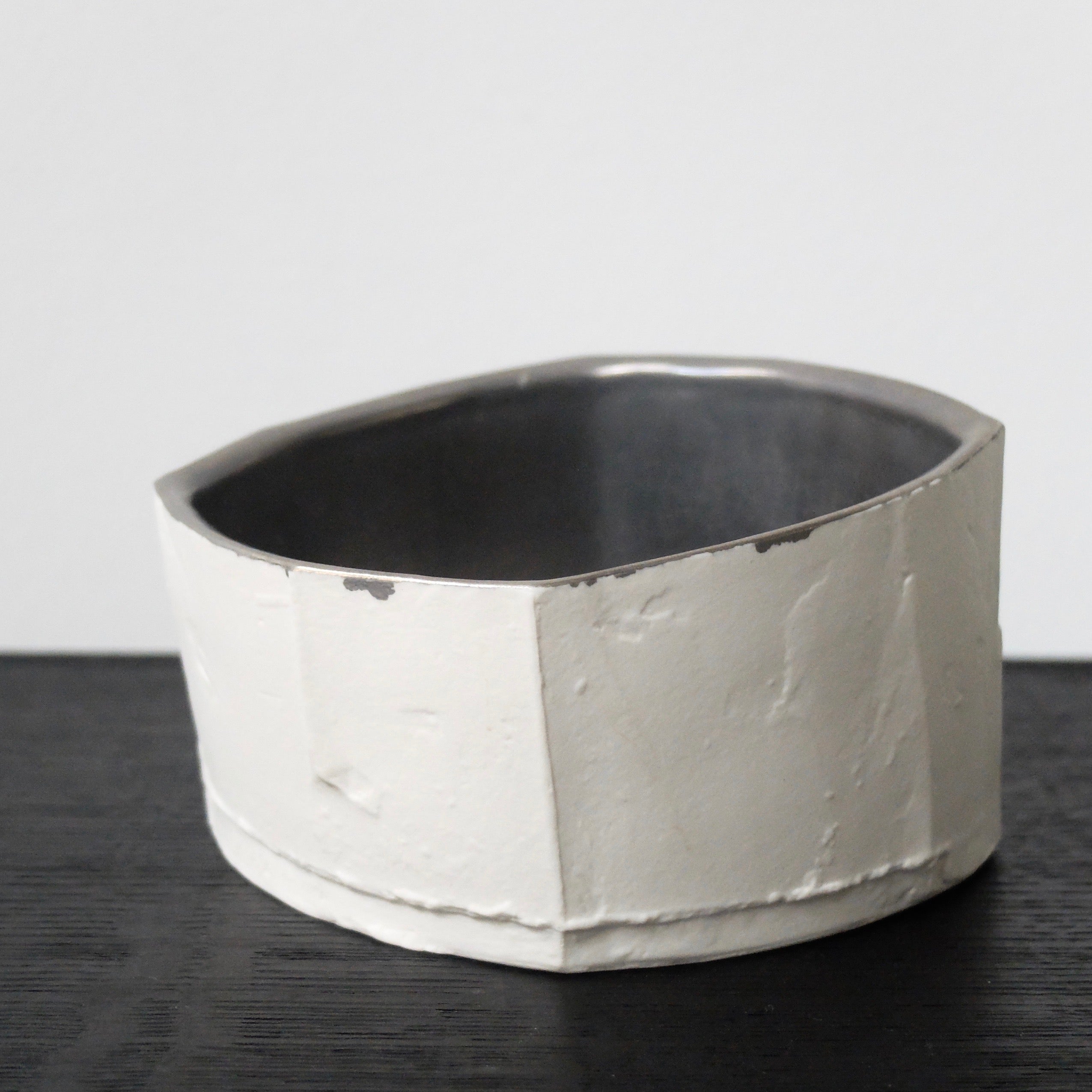 Wu cleverly balances tradition with innovation, celebrating the art of the tea ceremony. He pushes the boundaries of ceramics simultaneously, through creating his sculptural tea instruments. The precise forms are lightly textured and partially glazed with metallic silver tones, drawing in the eye to look closer.