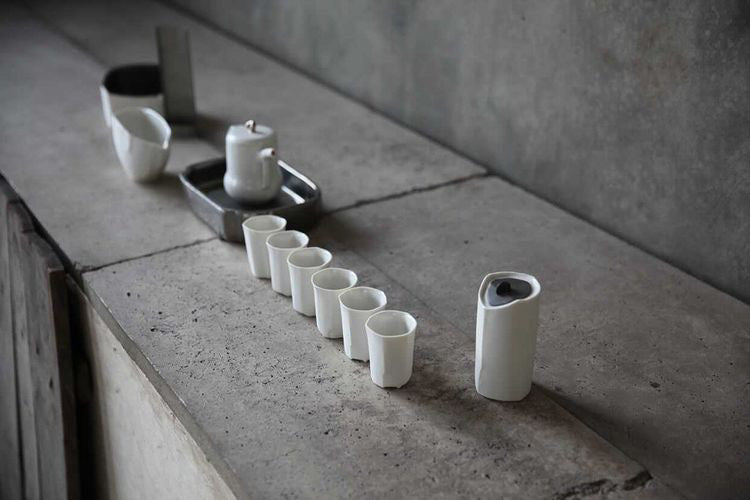 The installation leans towards minimalism, comprising of a teapot, a tea tray, a tea serving pot, a waste bowl, a tea caddy, six teacups and a teaspoon. The angular shapes are distinct to Wu's practice and make an exquisite collection of utensils used for brewing tea that can be treasured for a lifetime.