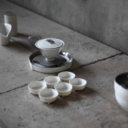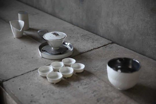 The installation leans towards minimalism, comprising of a teapot, a tea tray, a tea serving pot, a waste bowl, a tea caddy, six teacups and a teaspoon. The angular shapes are distinct to Wu's practice and make an exquisite collection of utensils used for brewing tea that can be treasured for a lifetime.