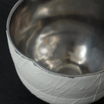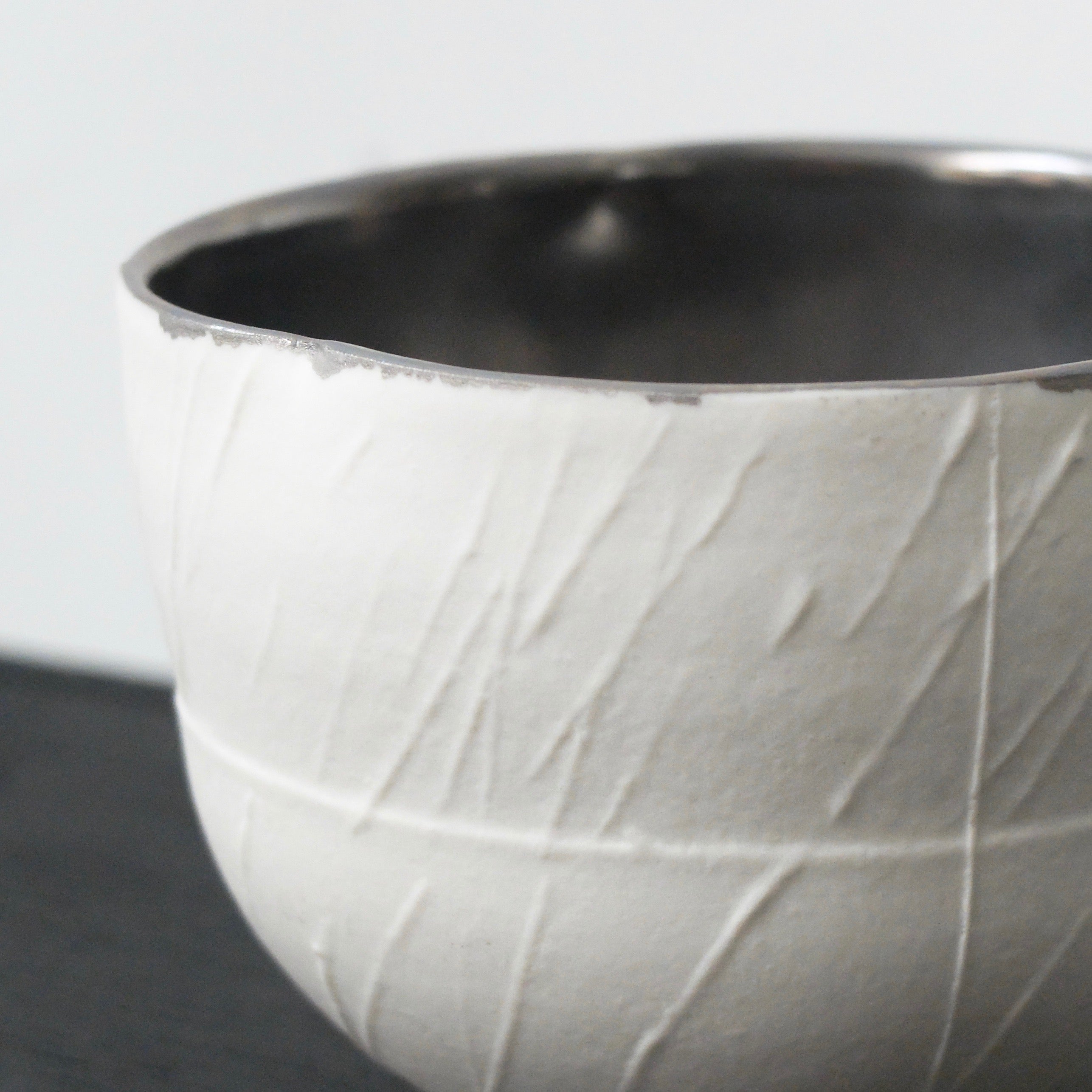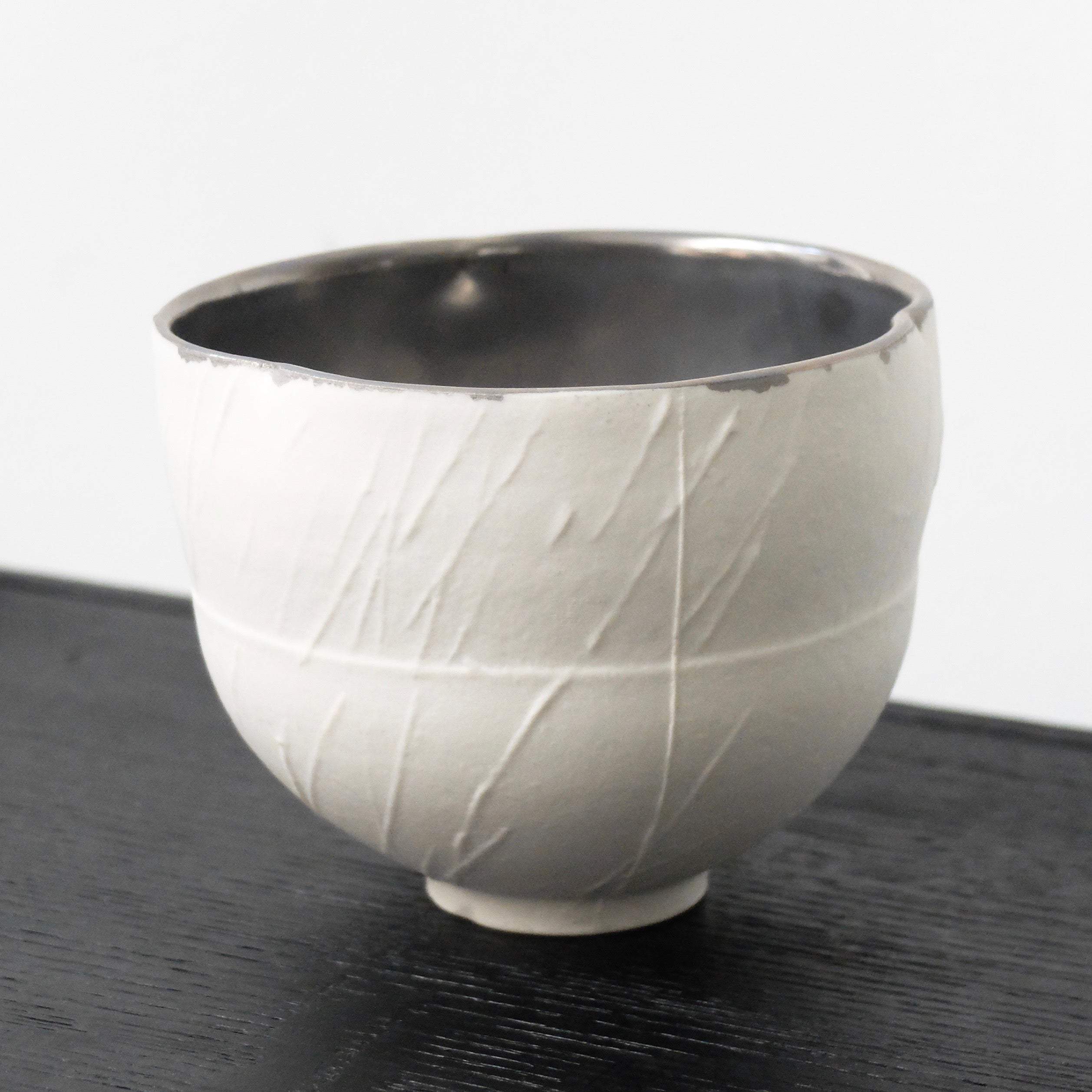 Wu cleverly balances tradition with innovation, celebrating the art of the tea ceremony. He pushes the boundaries of ceramics simultaneously, through creating his sculptural tea instruments. The precise forms are lightly textured and partially glazed with metallic silver tones, drawing in the eye to look closer.