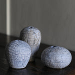 Perfectly balanced in form, tone and detail, a pebble vase with with small opening. The artist embellishes the vessels using indigo slip with sgraffito decoration, with a white glaze on top. Thom’s skill and eye for detail allows her to create unique patterns which are distinct to her practice. This particular vase has beautiful, dainty, white lines on the surface, as well as a blend of rich hues underneath.