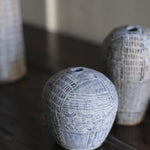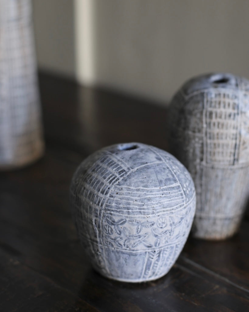 Method: these pieces are hand built, then Indigo slip is applied onto leather hard clay and the work is decorated using sgraffito technique, before being bisque fired and glazed with a matt white glaze.