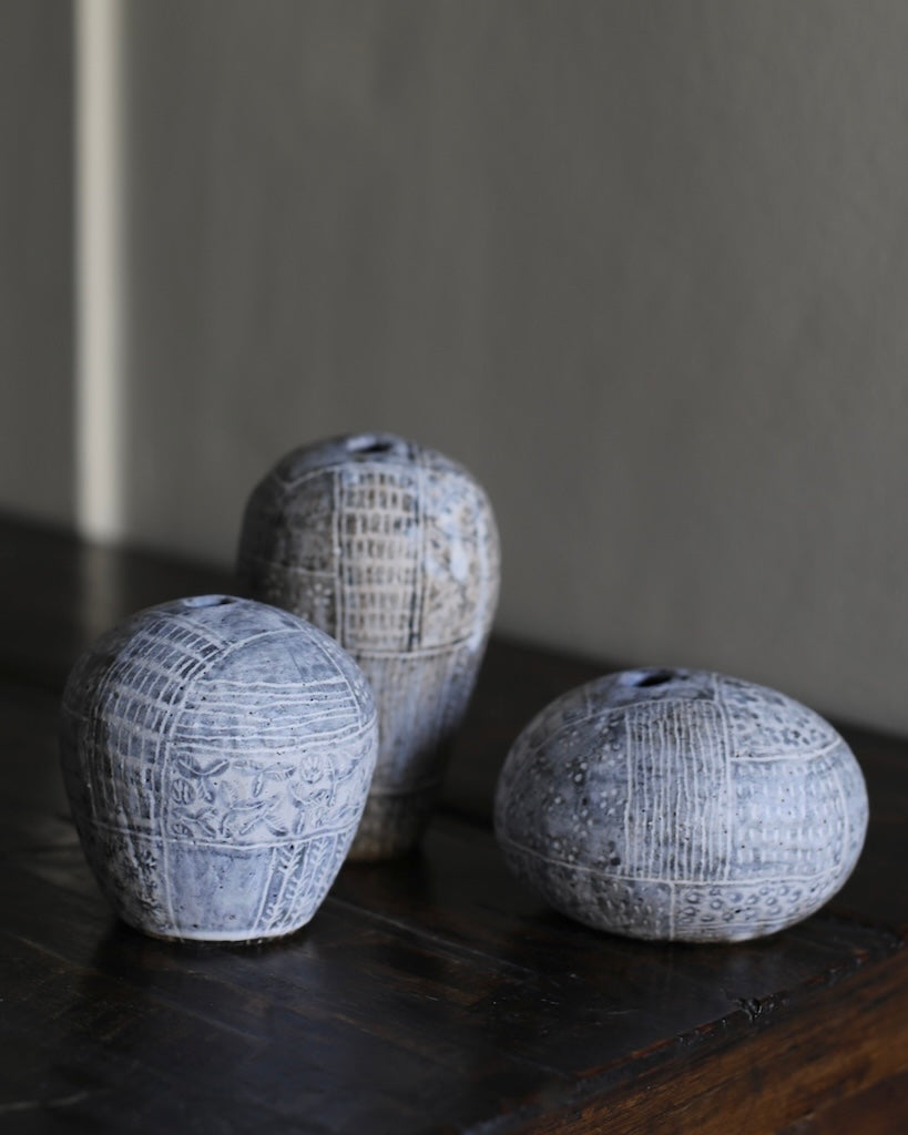Method: these pieces are hand built, then Indigo slip is applied onto leather hard clay and the work is decorated using sgraffito technique, before being bisque fired and glazed with a matt white glaze.