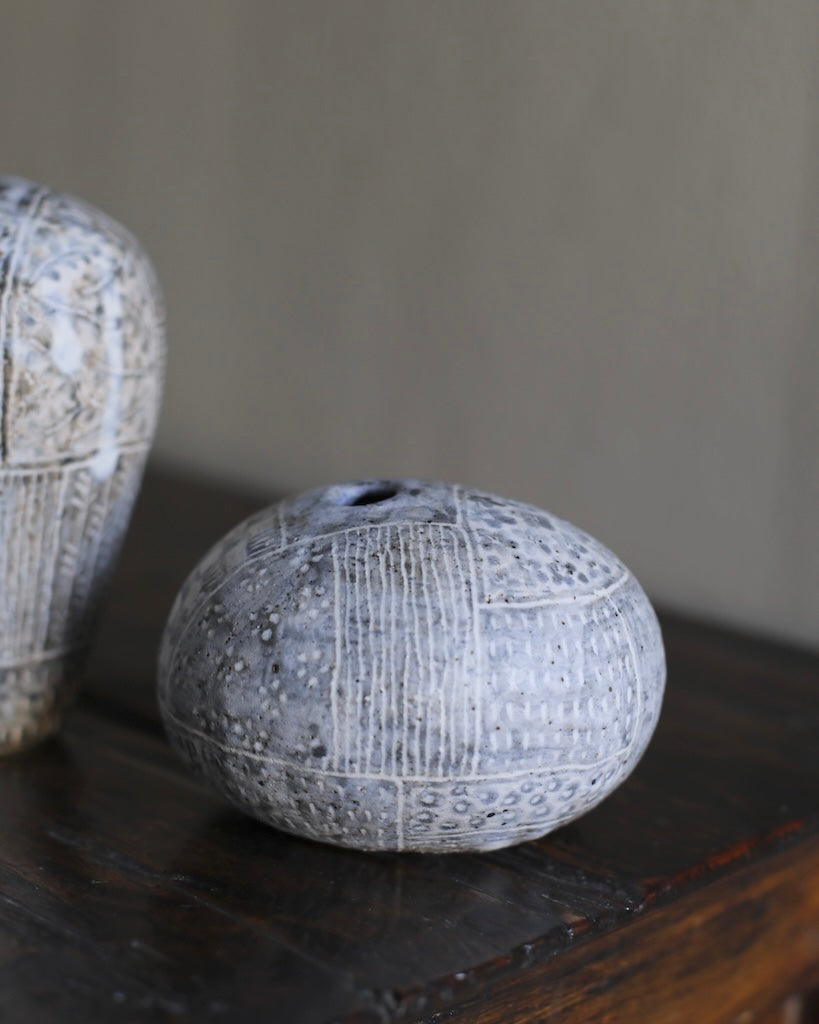 Perfectly balanced in form, tone and detail, a pebble vase with with small opening. The artist embellishes the vessels using indigo slip with sgraffito decoration, with a white glaze on top. Thom’s skill and eye for detail allows her to create unique patterns which are distinct to her practice. This particular vase has beautiful, dainty, white lines on the surface, as well as a blend of rich hues underneath.