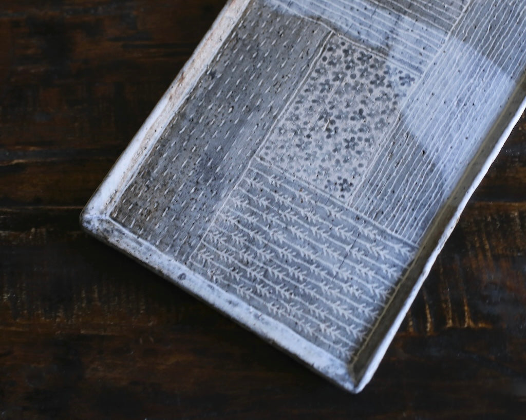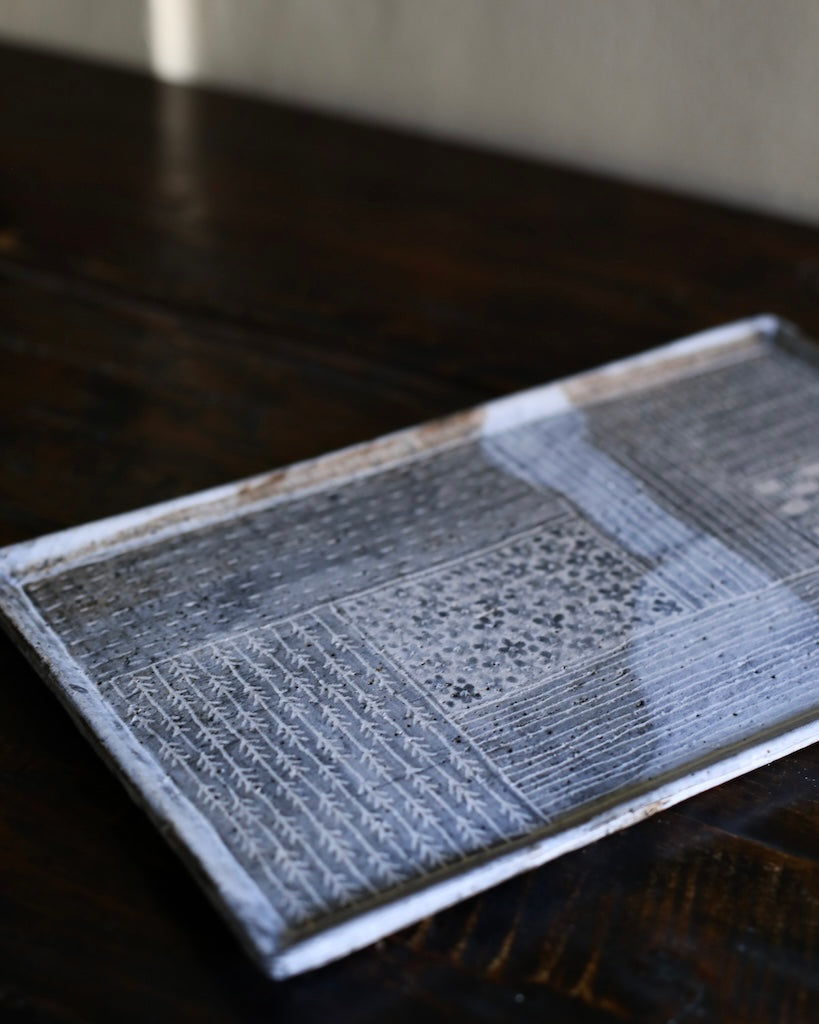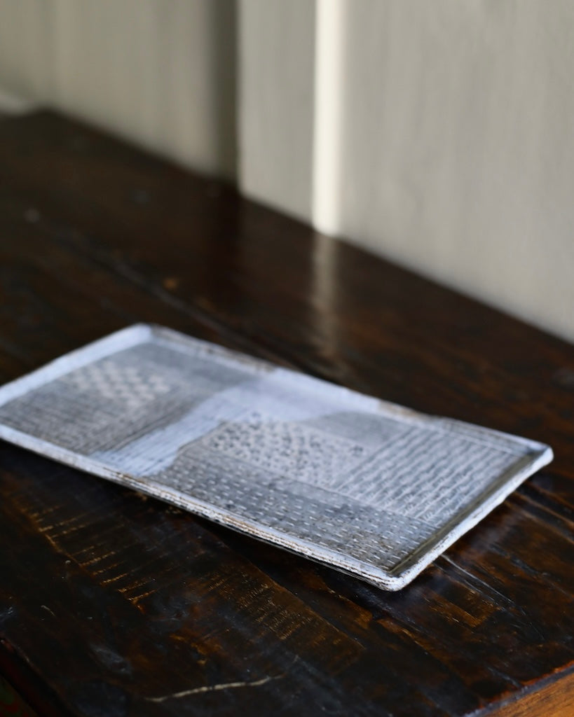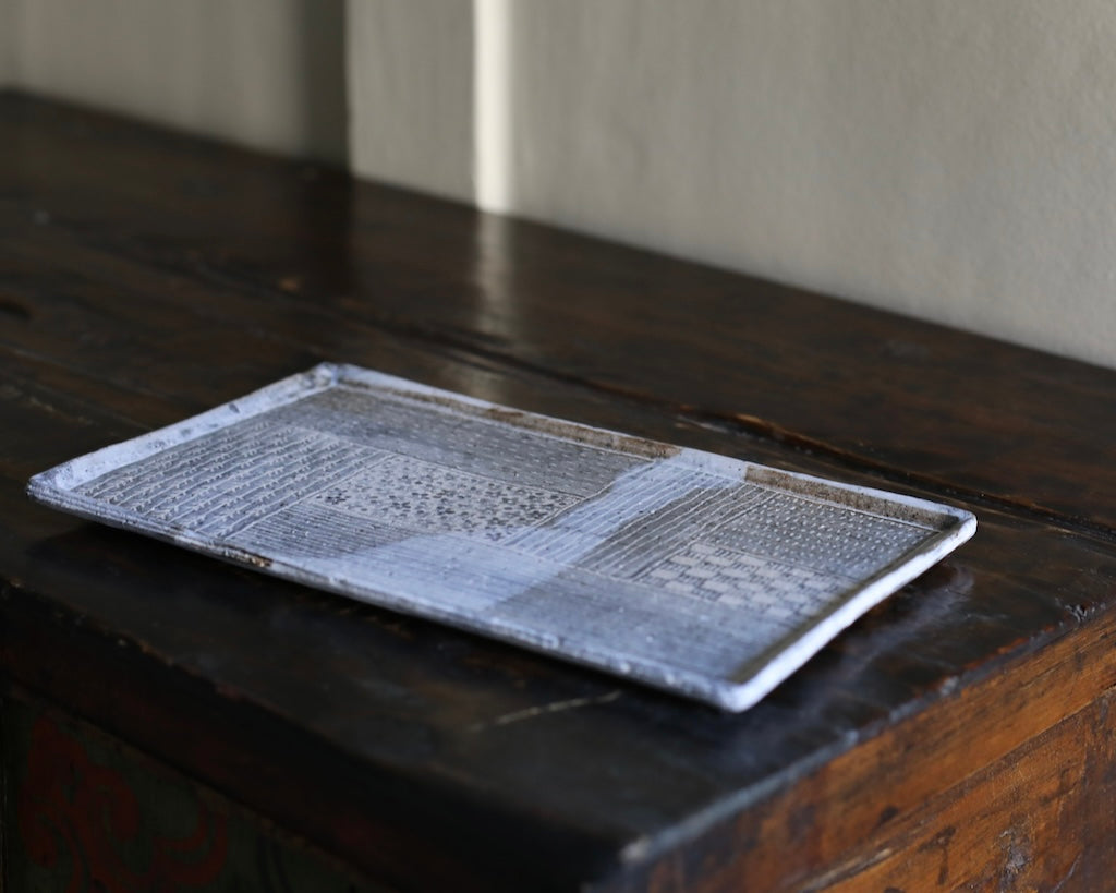 A beautiful rectangular shaped plate handcrafted by artist Yo Thom. Slab built with a blue angled lip at the edges. Inspired by her surroundings, the artist creates unique patterns on the surface of her works. This plate features a intricate hand painted details, which are distinct to Thom’s practice.