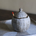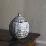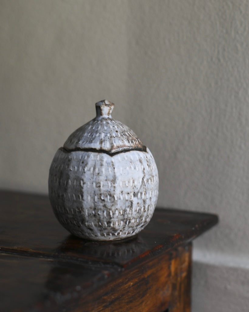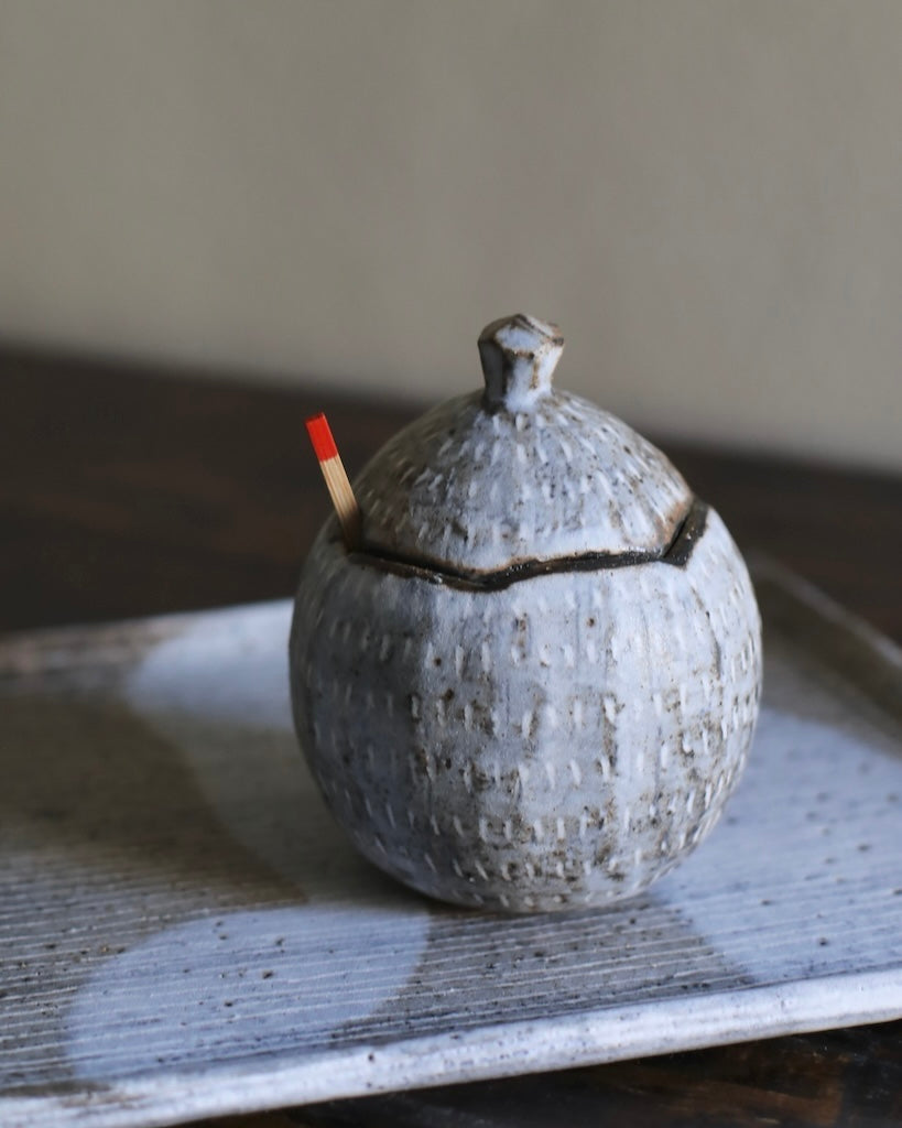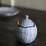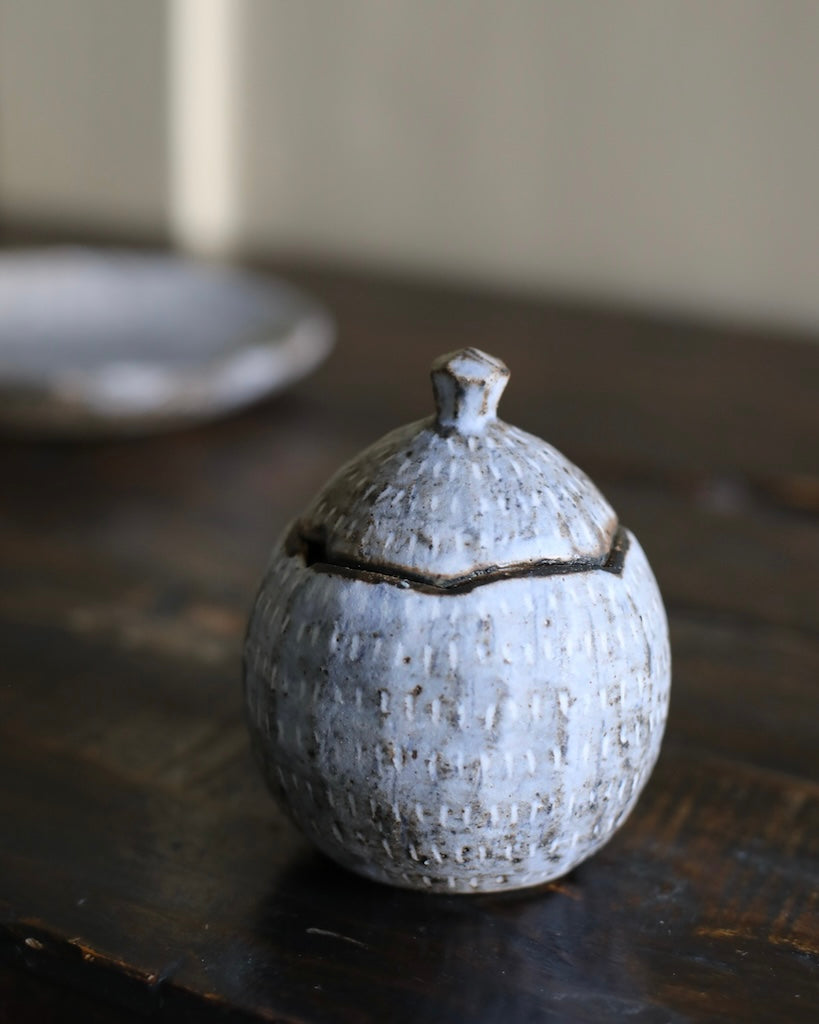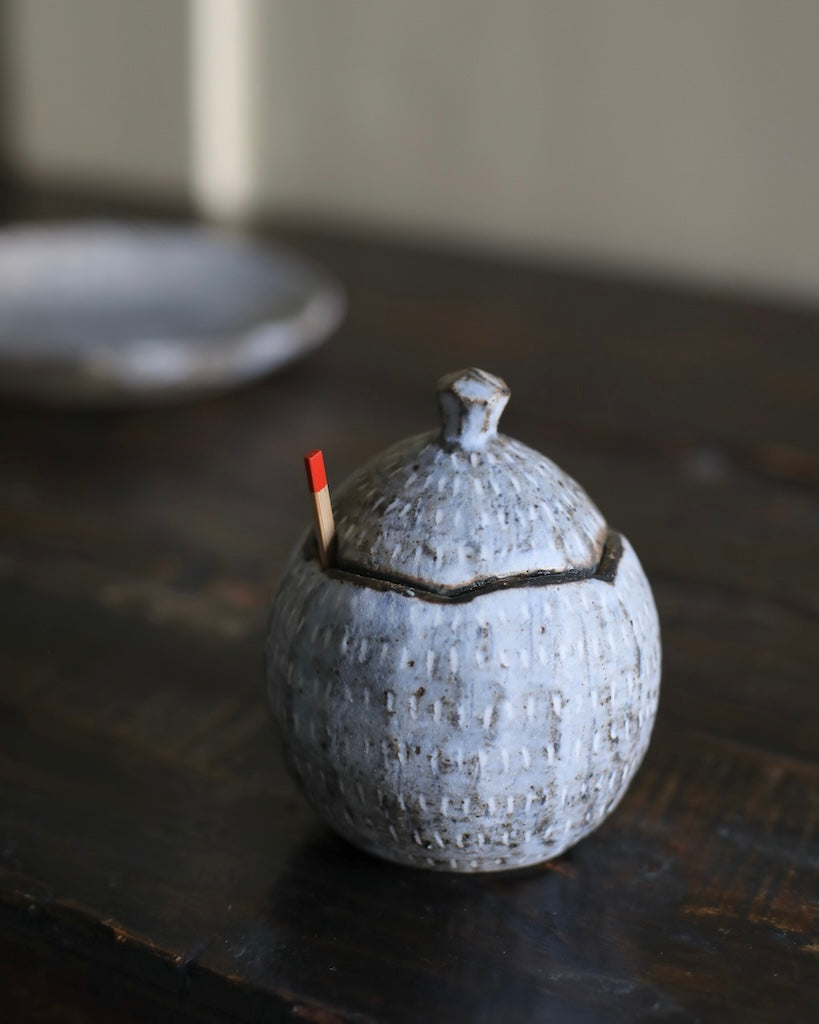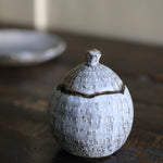This small stoneware spice pot is an intimate object, with a soft blue grey glaze, its rounded form rests comfortably in the palm. The fitted lid lifts cleanly, offering a moment of pause before seasoning. An intricate pattern hand painted by the artist, each piece is entirely unique in its finish. Ideal for salt, spices, or condiments, this pot brings intention to the everyday, transforming a simple pinch into a tactile, grounding ritual.