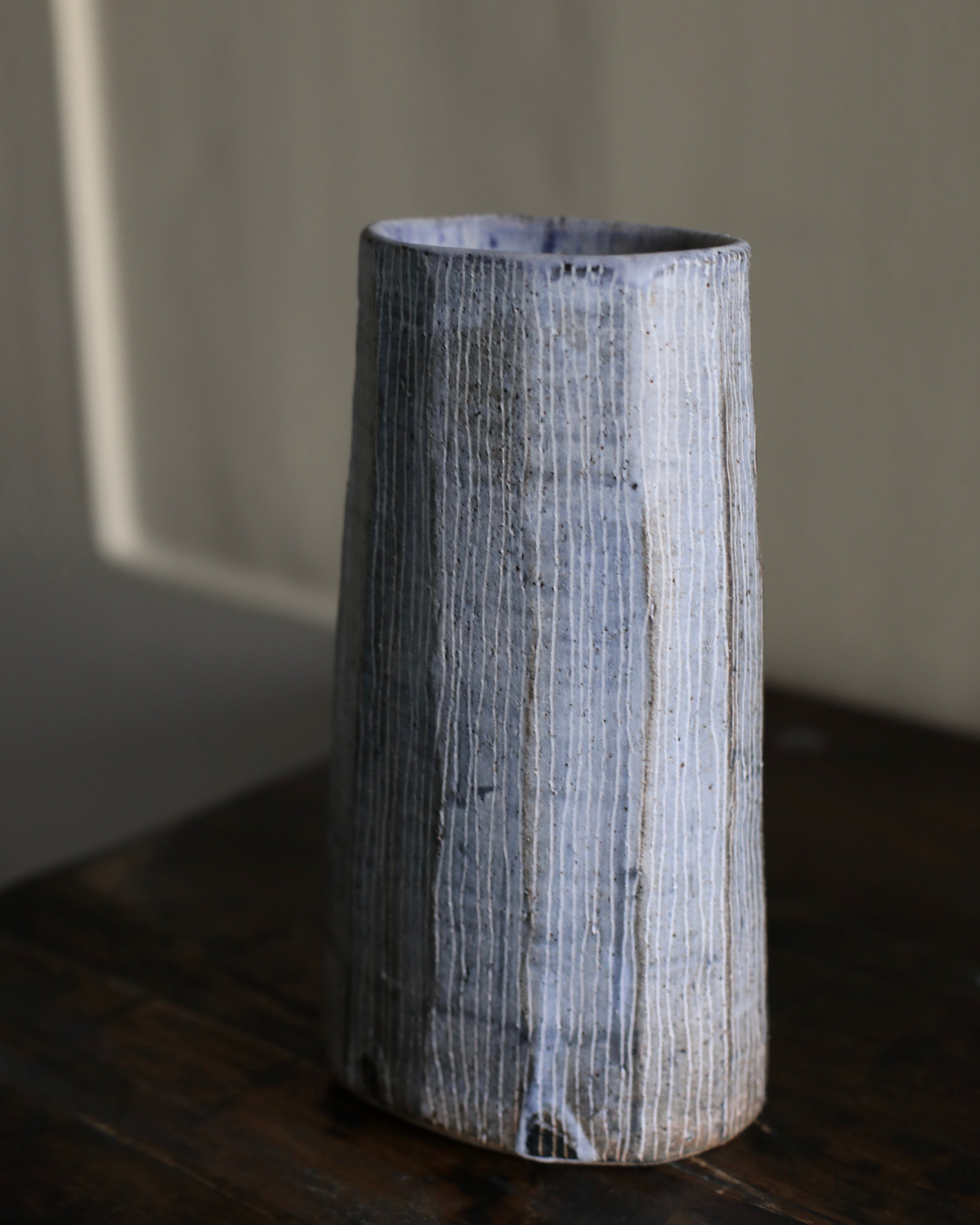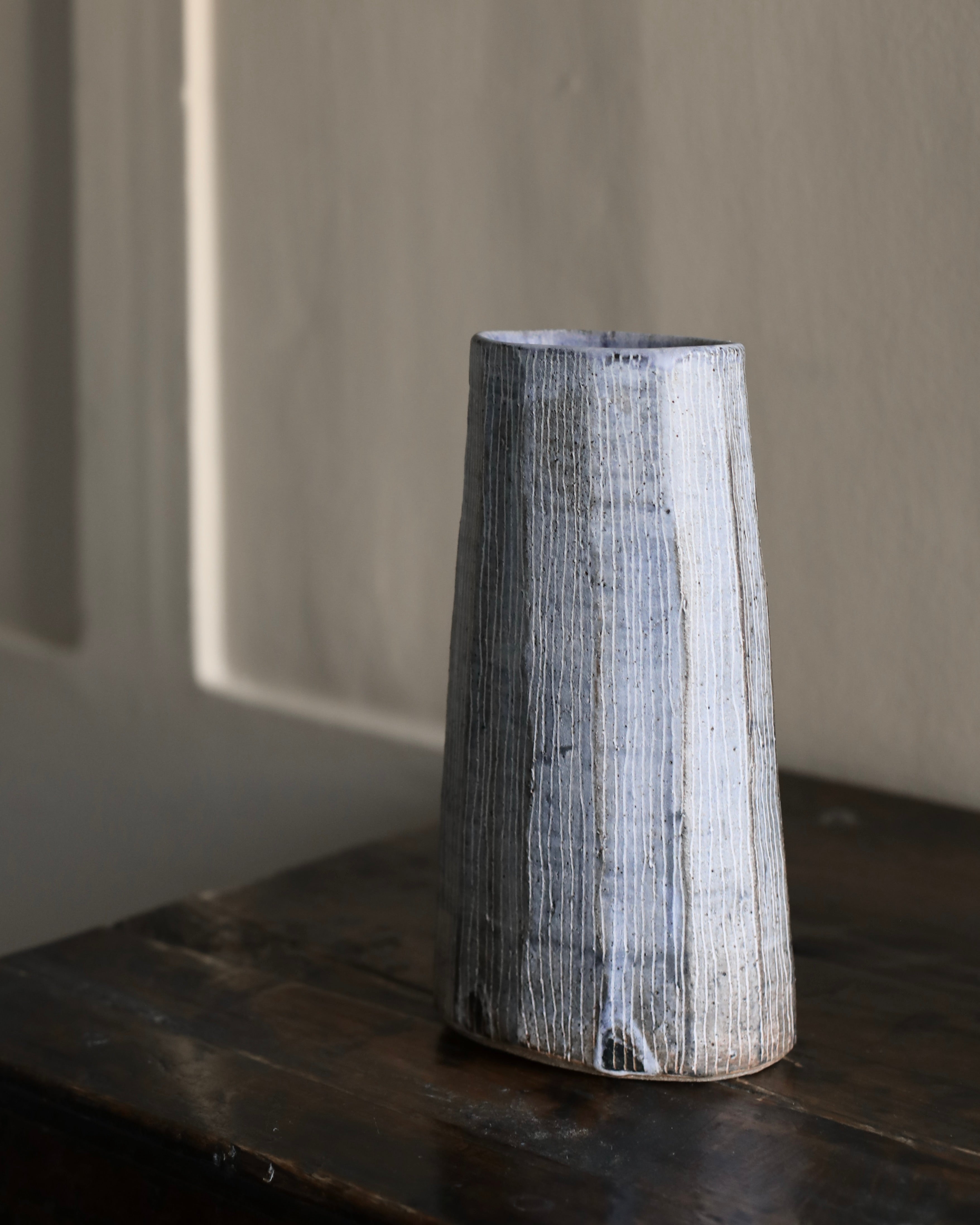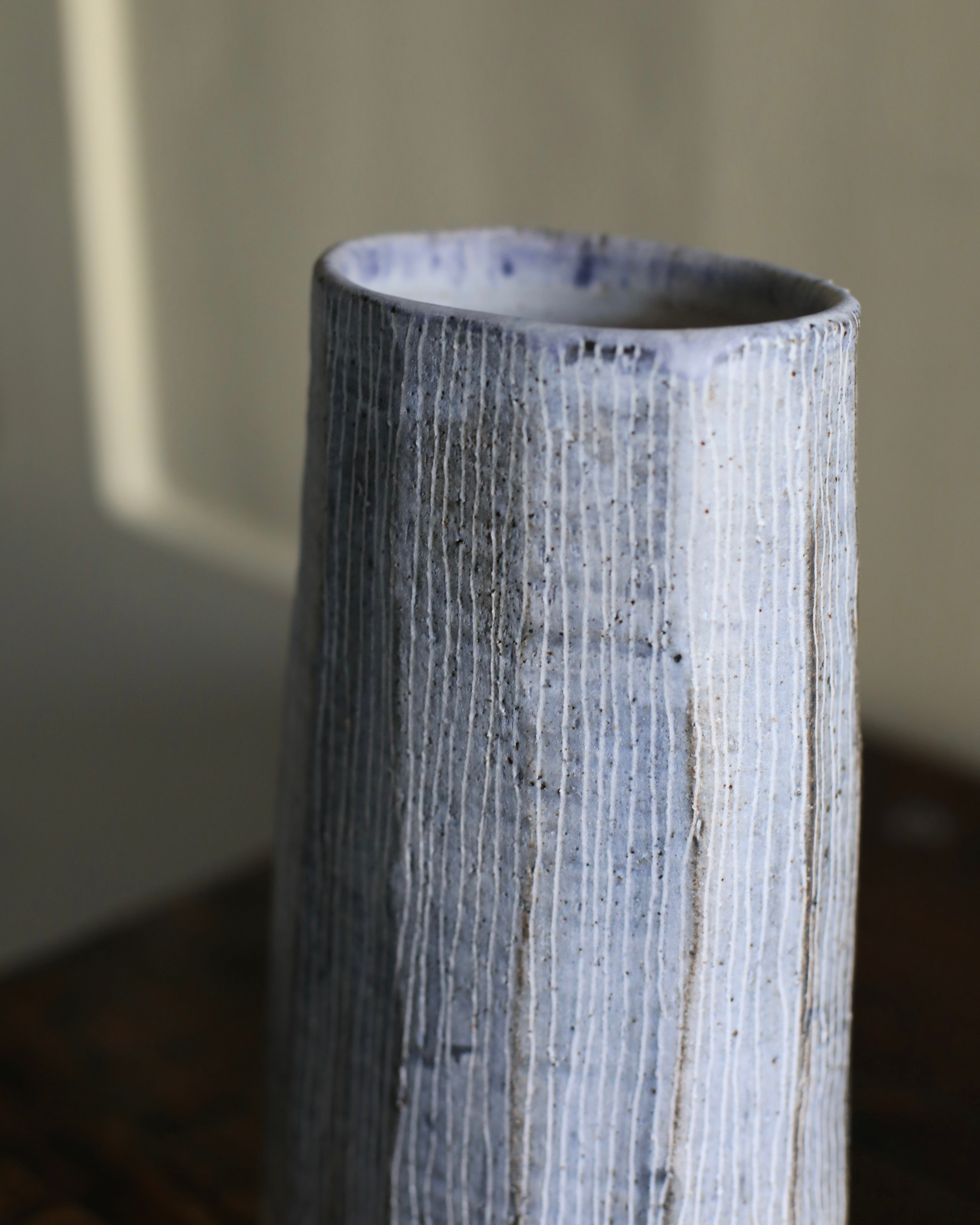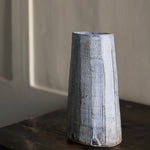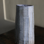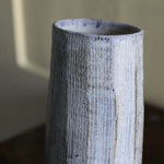 This tall, stoneware vase is handmade by artist Yo Thom. The elegant artwork sits immaculately and features an oval shaped opening. The artist embellishes the vessels using indigo slip with sgraffito decoration, with a white glaze on top. Thom’s skill and eye for detail allows her to create unique patterns which are distinct to her practice. This particular vase has beautiful, dainty, white lines on the surface, as well as a blend of rich hues underneath.