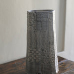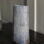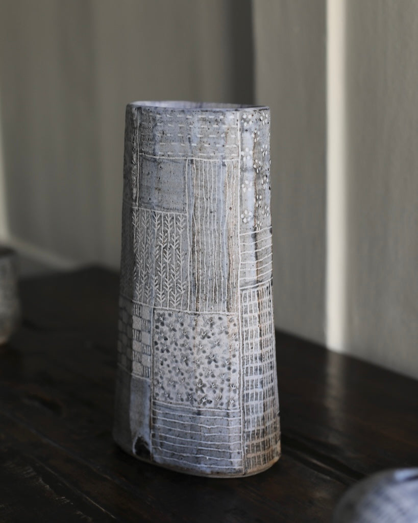This tall, stoneware vase is handmade by artist Yo Thom. The elegant artwork sits immaculately and features an oval shaped opening. The artist embellishes the vessels using indigo slip with sgraffito decoration, with a white glaze on top. Thom’s skill and eye for detail allows her to create unique patterns which are distinct to her practice. This particular vase has beautiful, dainty, white lines on the surface, as well as a blend of rich hues underneath.
