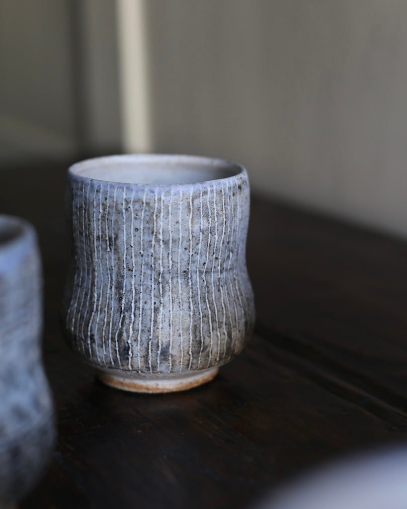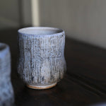 This beautiful Yunomi is handmade by artist Yo Thom, made for everyday use to drink green tea out of, usually with one hand. Inspired by her surroundings, the artist creates unique patterns on the surface of her works. This piece features combined shades of blue and brown on the exterior, with white intricate hand painted details including dash and floral patterns. They are distinct to Thom’s practice, inspired by the marks she discovers in her surroundings.