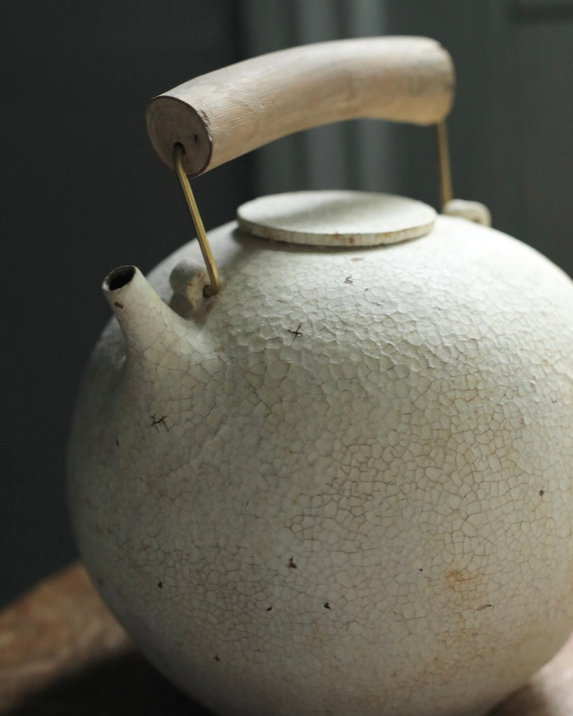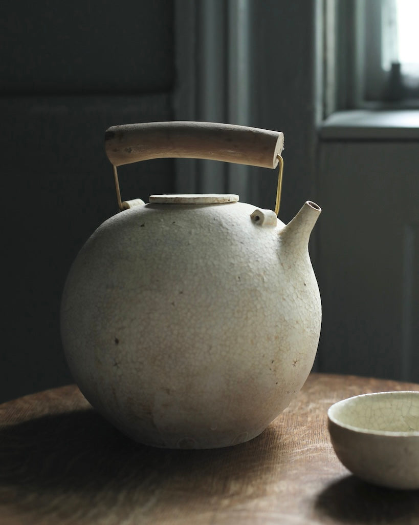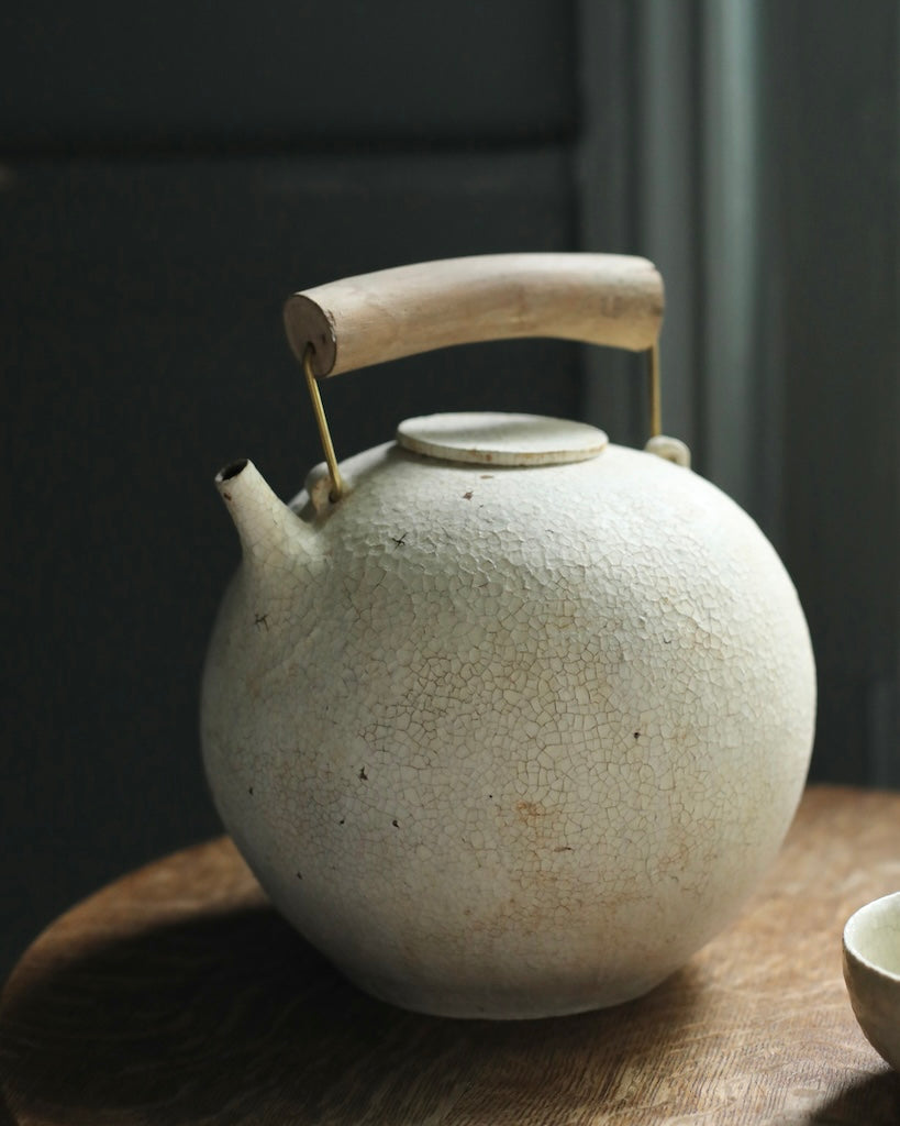 A precious teapot hand thrown by artist Yoko Ozawa that combines simple form with an exceptionally intricate surface. She uses clay from South Australia and makes her glaze with yellow box ash (eucalyptus) from her own fireplace. The natural crackle glaze creates a tangible, organic texture that enhances the characteristics of the forms that she skilfully makes. This is a great example of Ozawa’s flair for creating harmonious ceramics that explore the relationship between perfection and imperfection.
