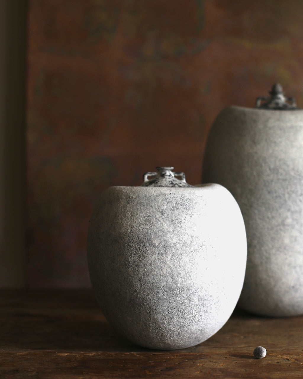 Bold brutalist forms meet the quiet elegance of Japanese craftsmanship. Each handmade ceramic piece is carefully carved in Yamada’s workshop, featuring a range of soft natural tones and a stone like texture that enhances their striking sculptural silhouettes. Sharp lines and oblong shapes contrast beautifully with delicate, organic details, while a rich matte finish and intricate mark-making reveal the energy of the artist’s process.