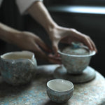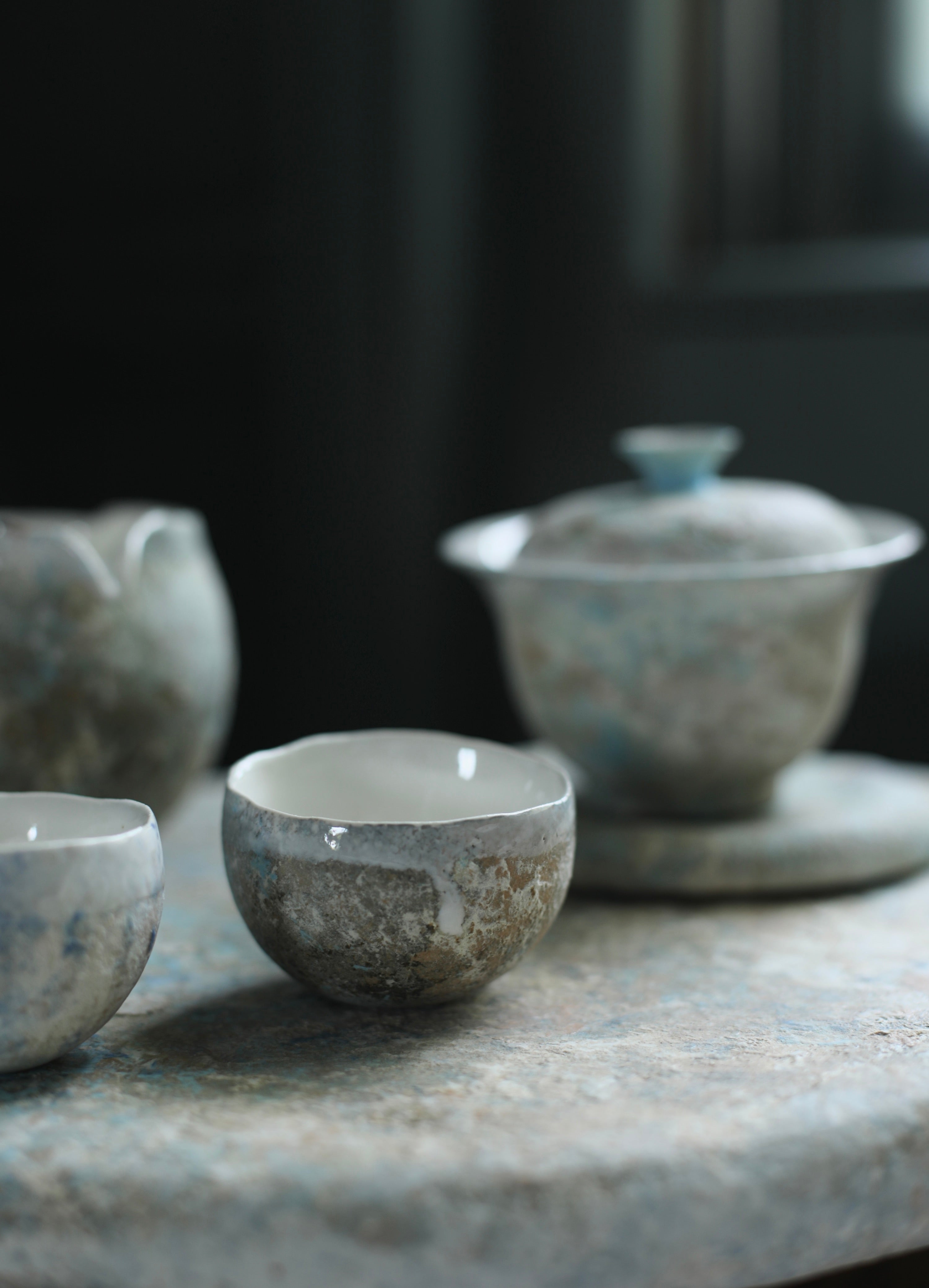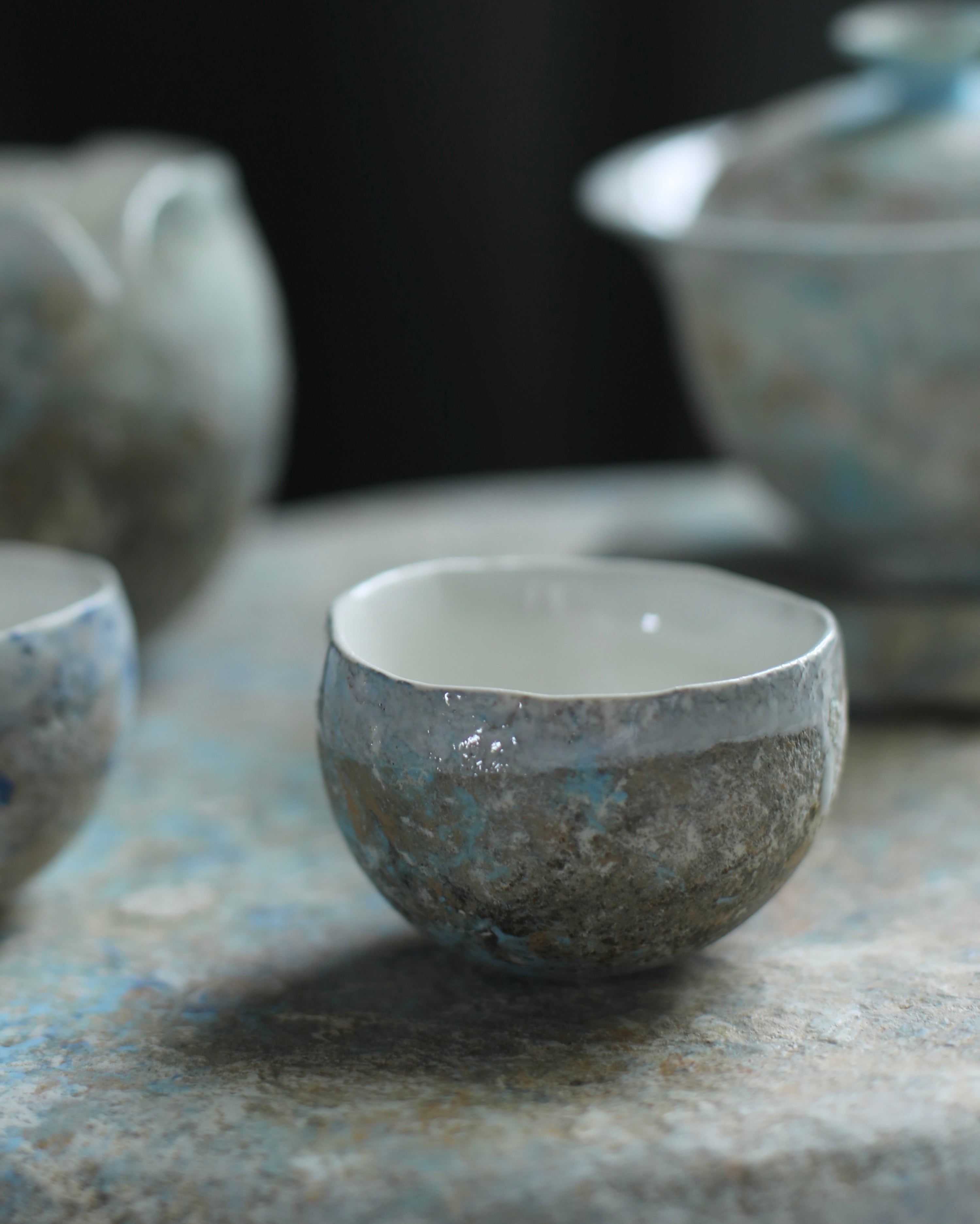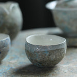 This porcelain tea cup is made using hand-building, wheel-throwing, and mold techniques. Blue and earthy tones combine across the surface, with a white glaze lining the interior and outer rim. Subtle contrasts in texture and colour reflect a quiet balance between form and function.