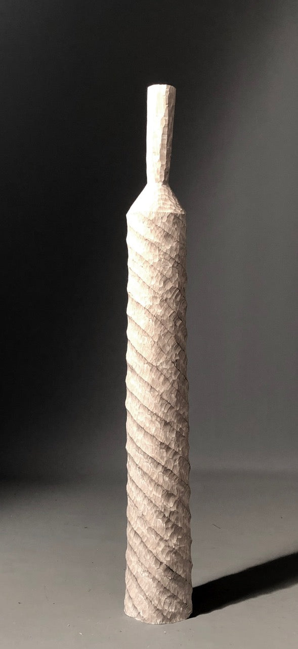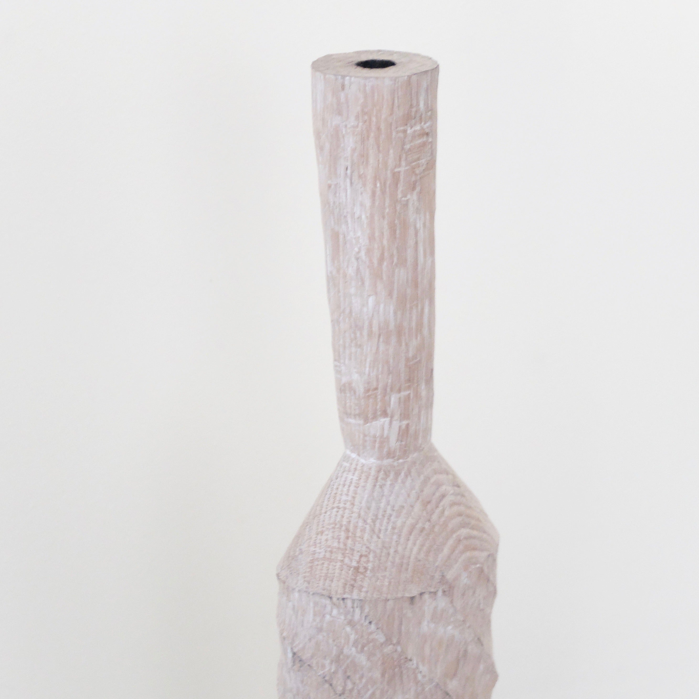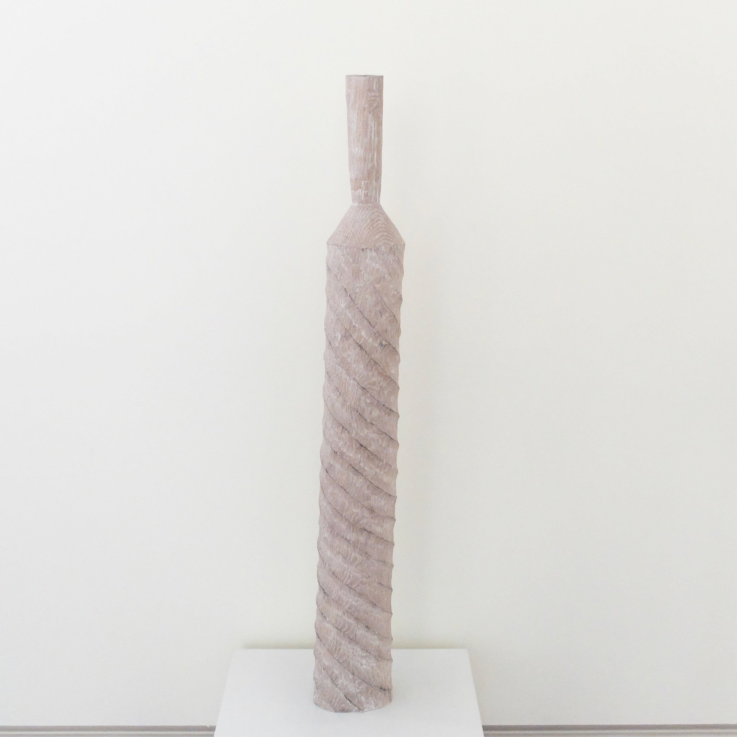 Beautifully made by Malcolm Martin and Gaynor Dowling, this tall bottle was carved using limed and scorched oak, by working with traditional hand-tool techniques. The wood is light in colour, with striking grooves on the outer layer that move horizontally from the base to the peak. With an elongated neck, this piece stands tall, resting flawlessly in any room. The repeated ridges offer an intriguingly tactile surface that is distinct to Martin and Dowling’s extraordinary works of art.