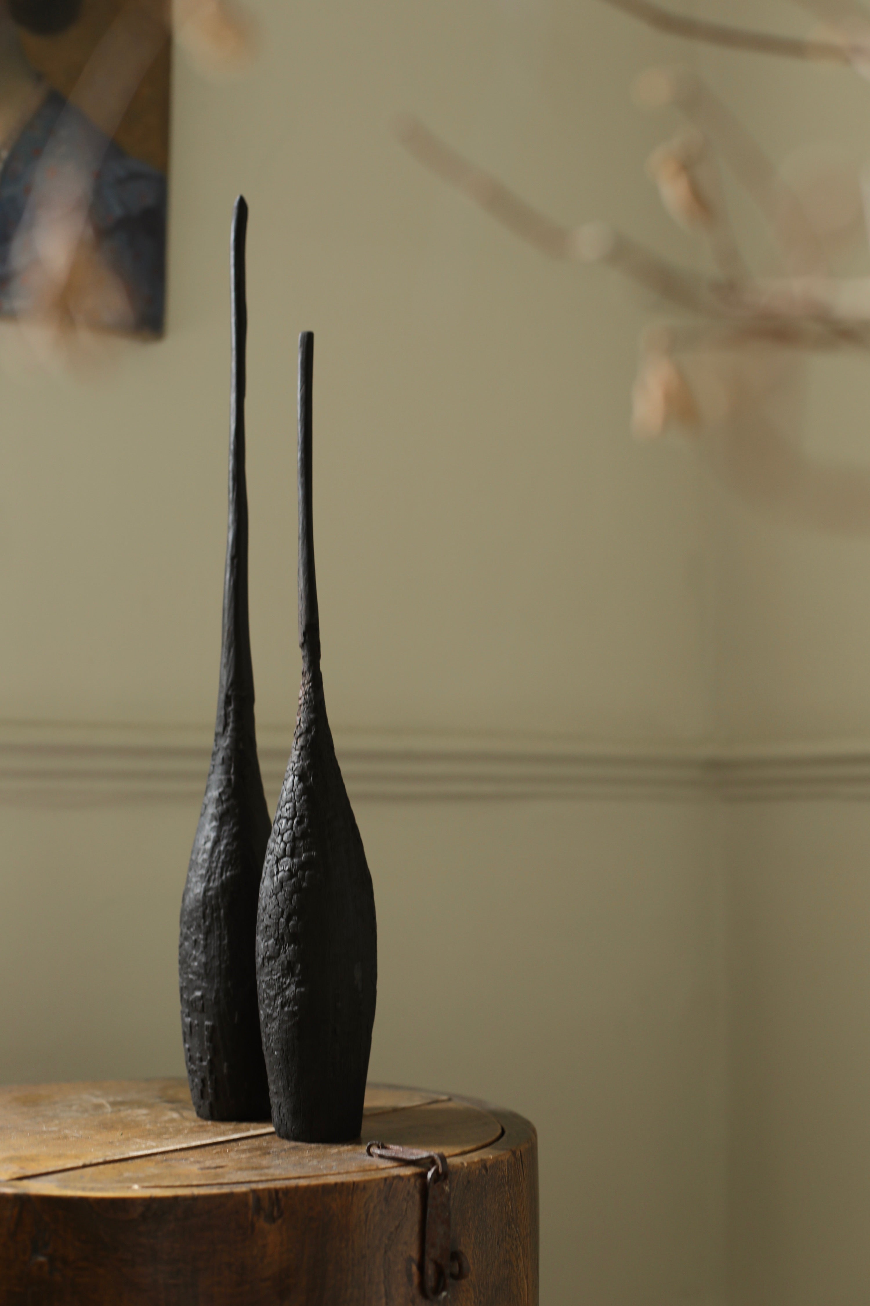 Method: Turned on a lathe and hand carved, the pieces are burnt using fire and compressed air. A compound with an iron base is then added and the pieces are finished using a combination of artist's fixatives, spray varnishes and beeswax and then left outside in the sun for at least 2-3 weeks