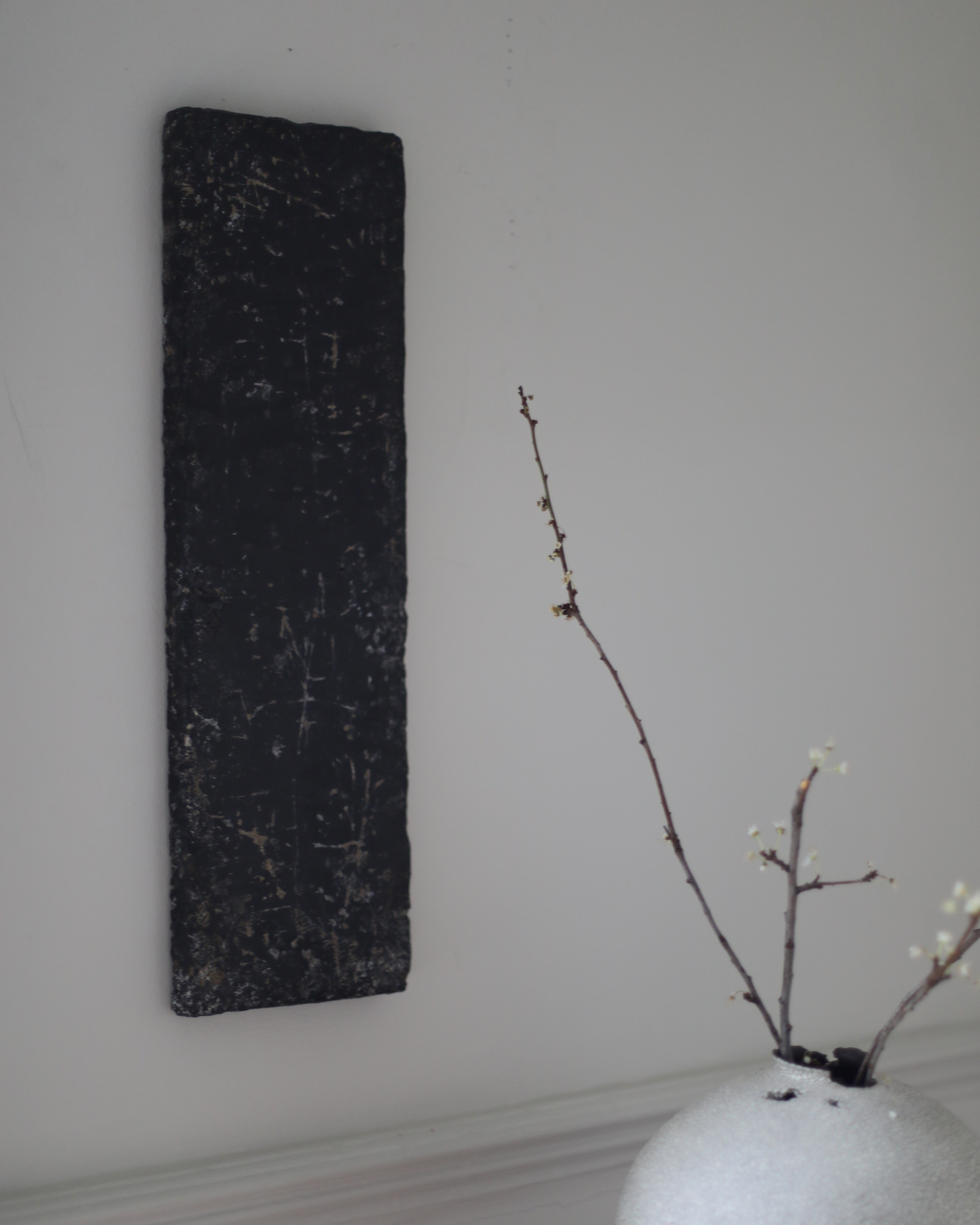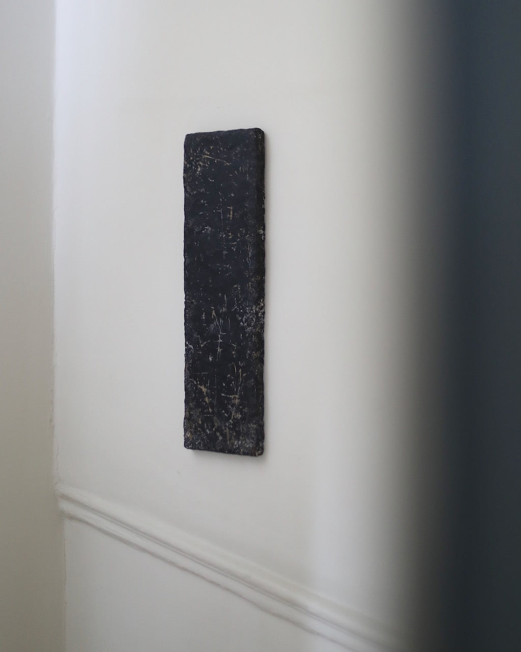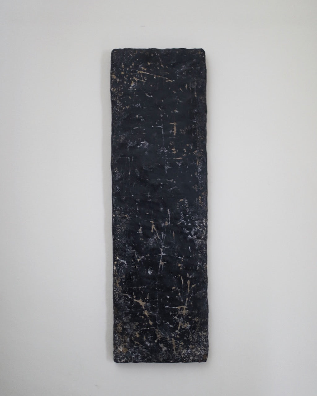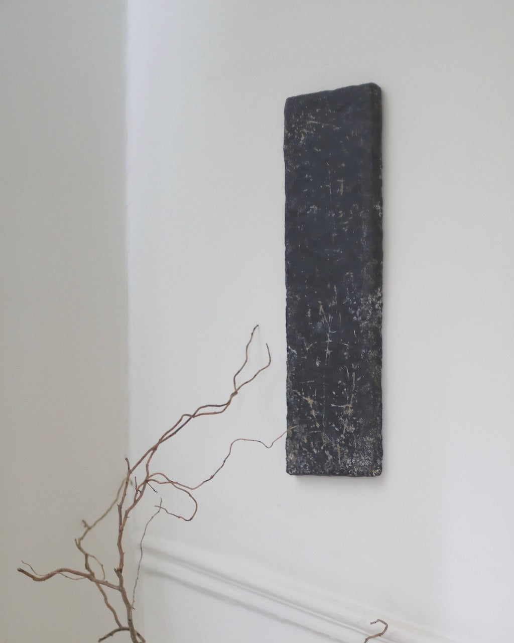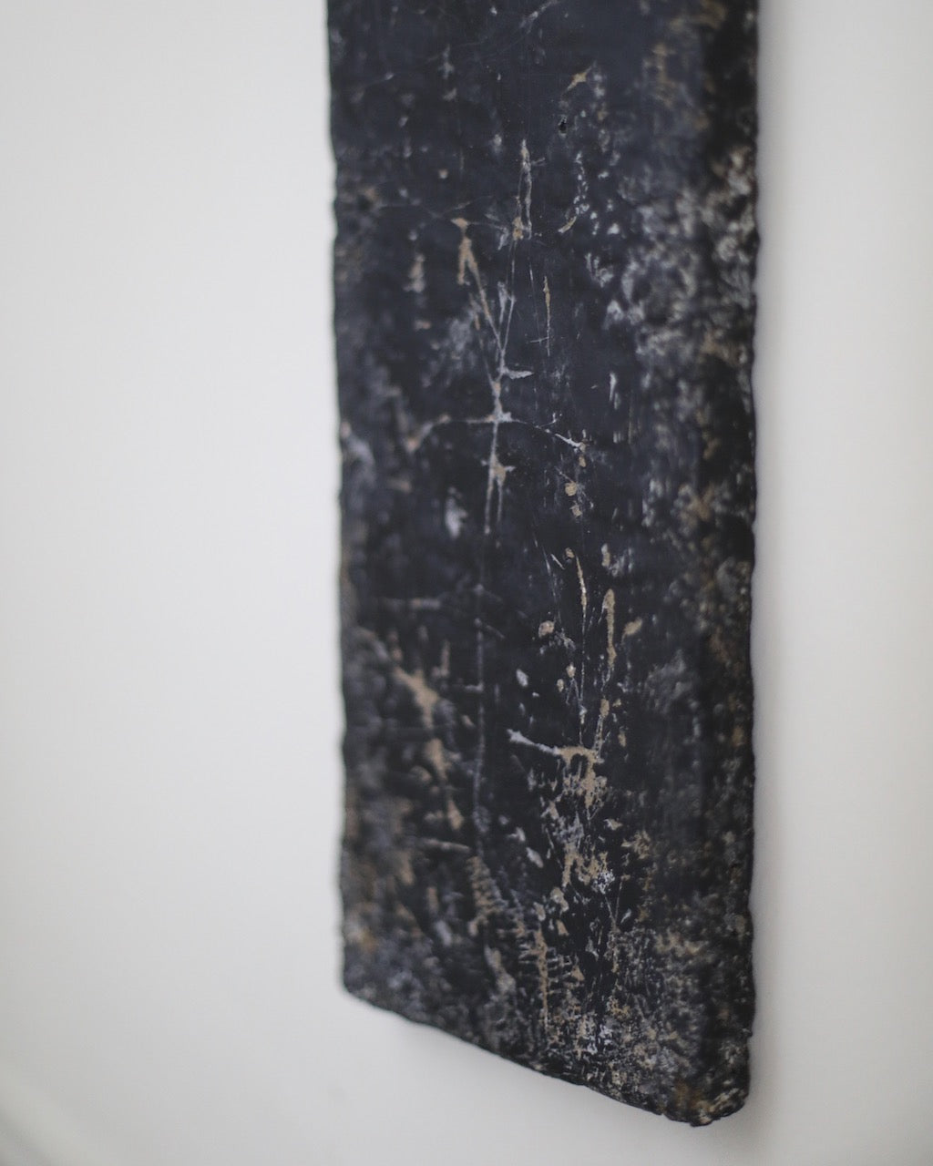 Emi Suzuki’s 泥(Mud) paintings are spread and polished using a technique influenced by traditional Japanese plastering techniques. Her repetitive process of scratching, shaving, polishing and spreading, helps her work to mirror aspects of nature which take many years to accumulate.